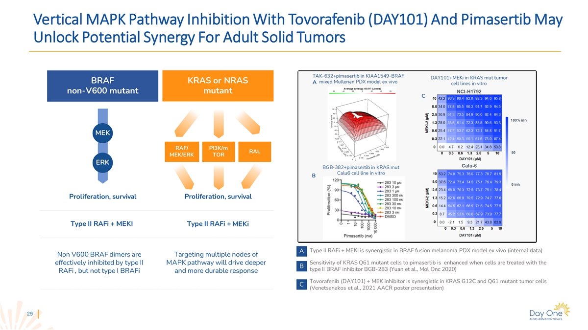 Pimasertib: Investigational Allosteric MEK1/2 Inhibitor With Demonstrated Activity In MAPK-Driven Solid Tumors • Pimasertib is an investigational orally-bioavailable, selective, non-competitive MEK1/2 inhibitor in-licensed from Merck KGaA in February 2021 • Extensive non-clinical and clinical development work through Phase 2, including a solid tumor trial in Japan and combinations with other MOAs • Main AEs typical for all in-class allosteric MEK inhibitors (GI, CPK elevation, skin rash, visual disturbances) • Nearly three-fold higher CNS penetration than other MEKi inhibitors (trametinib or selumetinib) • Pimasertib showed monotherapy clinical activity, including an improvement in median PFS versus dacarbazine in NRAS mutant melanoma • Combination with tovorafenib (DAY101) and other targeted therapies may unlock the full value of pimasertib in advanced solid tumors 28 Sources: Pimasertib Investigator Brochure, v12, 2019; de Gooijer et al., Int J Cancer, 2018; Shaw et al., AACR LB-456, 2012; Lebbe et al., Cancers, 2020.