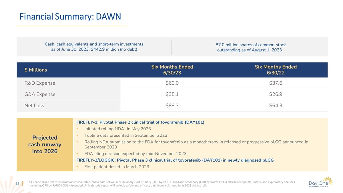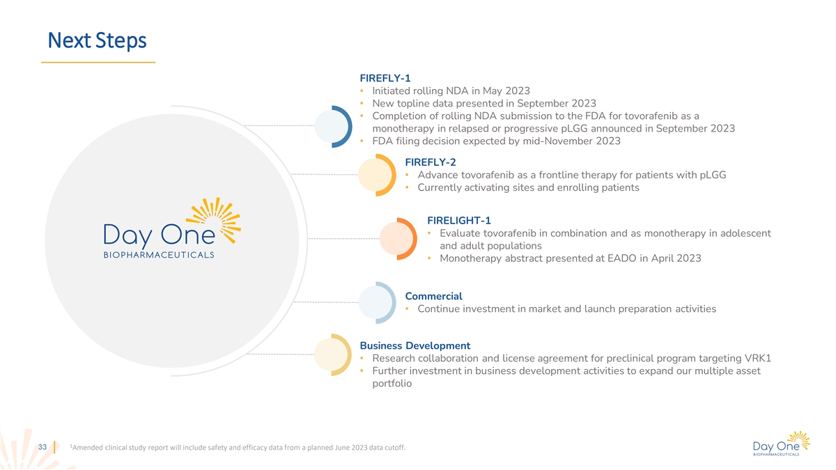 Financial Summary: DAWN Cash, cash equivalents and short-term investments ~87.0 million shares of common stock as of June 30, 2023: $442.9 million (no debt) outstanding as of August 1, 2023 Six Months Ended Six Months Ended $ Millions 6/30/23 6/30/22 R&D Expense $60.0 $37.6 G&A Expense $35.1 $26.9 Net Loss $88.3 $64.3 FIREFLY-1: Pivotal Phase 2 clinical trial of tovorafenib (DAY101) 1 • Initiated rolling NDA in May 2023 • Topline data presented in September 2023 Projected • Rolling NDA submission to the FDA for tovorafenib as a monotherapy in relapsed or progressive pLGG announced in cash runway September 2023 into 2026 • FDA filing decision expected by mid-November 2023 FIREFLY-2/LOGGIC: Pivotal Phase 3 clinical trial of tovorafenib (DAY101) in newly diagnosed pLGG • First patient dosed in March 2023 1 All financial and share information is unaudited. NDA data set will include analysis of primary (ORR by RANO-HGG) and secondary (ORR by RAPNO, PFS) efficacy endpoints, safety, and exploratory analyses 32 2 (including ORR by RANO-LGG). Amended clinical study report will include safety and efficacy data from a planned June 2023 data cutoff.