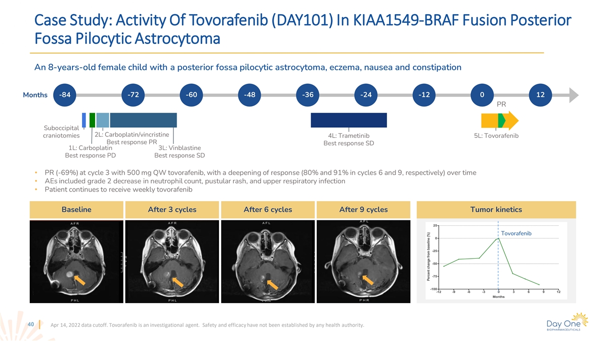 Case Study: Activity Of Tovorafenib (DAY101) In KIAA1549-BRAF Fusion Optic Pathway Glioma A 7-years-old female child with an optic pathway glioma, with very poor vision, entropion, folliculitis, eczema, mouth ulceration and xerosis -36 6 Months -30 -24 -18 -12 -6 0 PR Diagnostic biopsy 3L: Tovorafenib 1L: Vincristine/carboplatin Best response SD 2L: Trametinib Best response PD • PR (-58%) and improvement in vision reported at cycle 3 • AEs included grade 3 erythematous rash requiring dose interruption and dose reduction (400 mg QW to 300 mg QW in cycle 1), and grade 2 eczema and maculopapular rash • Patient continues to receive weekly tovorafenib Baseline After 6 cycles Tumor kinetics (RANO) Tovorafenib 39 Apr 14, 2022 data cutoff. Tovorafenib is an investigational agent. Safety and efficacy have not been established by any health authority.