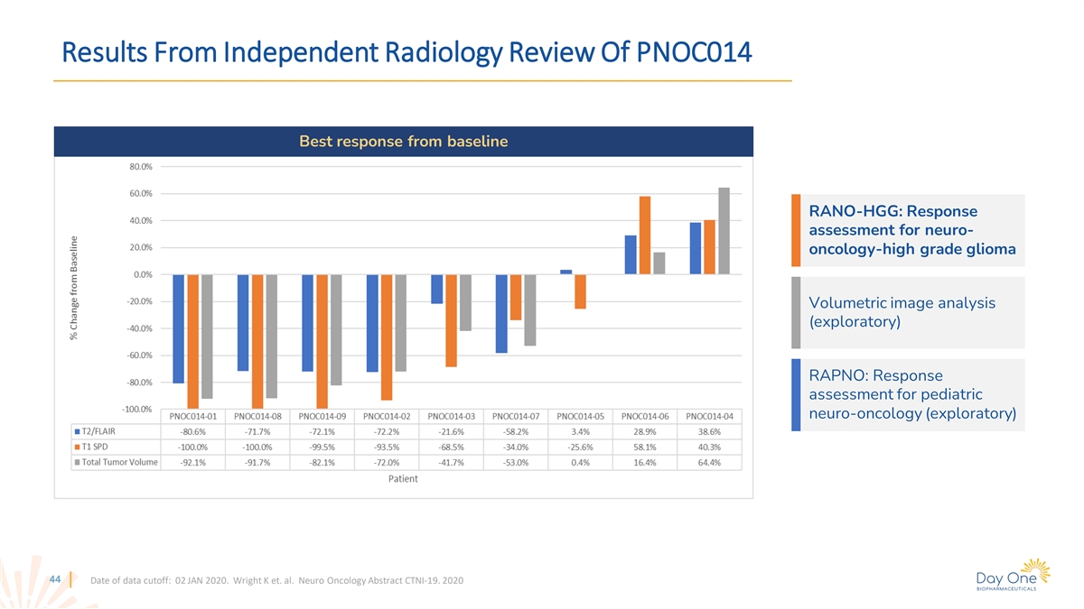 Results From Independent Radiology Review Of PNOC014 Best response from baseline RANO-HGG: Response assessment for neuro- oncology-high grade glioma Volumetric image analysis (exploratory) RAPNO: Response assessment for pediatric neuro-oncology (exploratory) 44 Date of data cutoff: 02 JAN 2020. Wright K et. al. Neuro Oncology Abstract CTNI-19. 2020