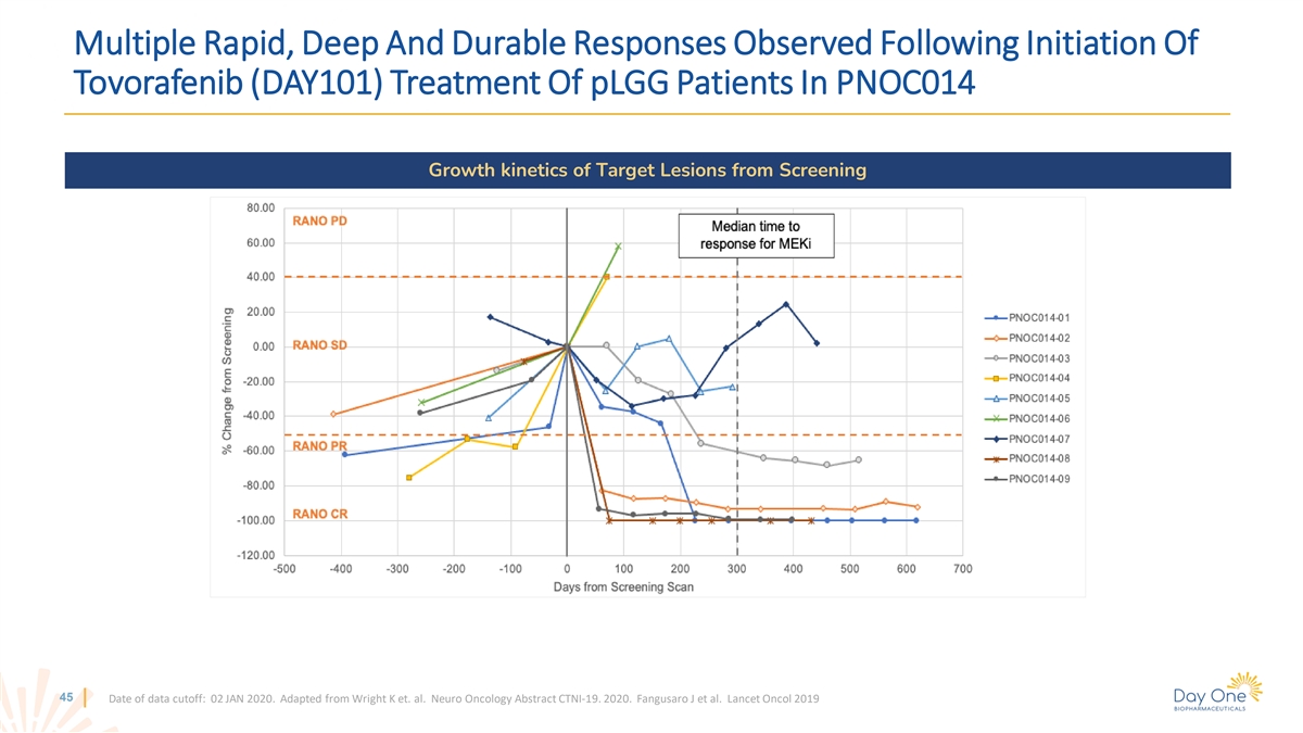 Multiple Rapid, Deep And Durable Responses Observed Following Initiation Of Tovorafenib (DAY101) Treatment Of pLGG Patients In PNOC014 Growth kinetics of Target Lesions from Screening 45 Date of data cutoff: 02 JAN 2020. Adapted from Wright K et. al. Neuro Oncology Abstract CTNI-19. 2020. Fangusaro J et al. Lancet Oncol 2019
