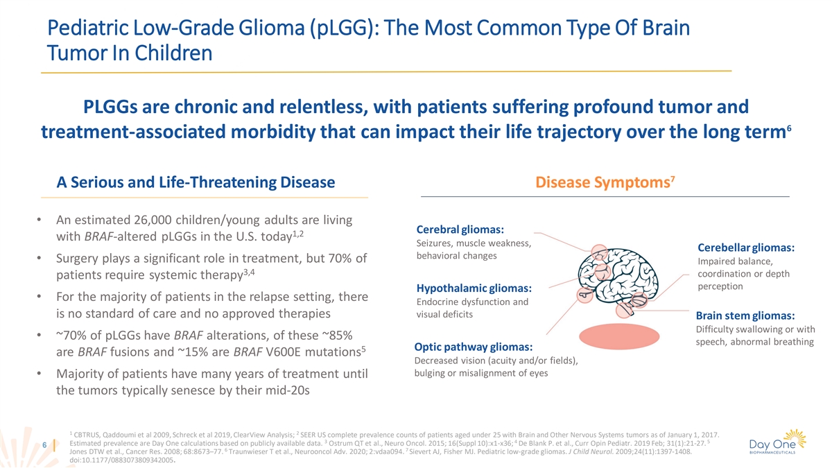 Pediatric Low-Grade Glioma (pLGG): The Most Common Type Of Brain Tumor In Children PLGGs are chronic and relentless, with patients suffering profound tumor and 6 treatment-associated morbidity that can impact their life trajectory over the long term 7 A Serious and Life-Threatening Disease Disease Symptoms • An estimated 26,000 children/young adults are living Cerebral gliomas: 1,2 with BRAF-altered pLGGs in the U.S. today Seizures, muscle weakness, Cerebellar gliomas: behavioral changes • Surgery plays a significant role in treatment, but 70% of Impaired balance, 3,4 coordination or depth patients require systemic therapy perception Hypothalamic gliomas: • For the majority of patients in the relapse setting, there Endocrine dysfunction and is no standard of care and no approved therapies visual deficits Brain stem gliomas: Difficulty swallowing or with • ~70% of pLGGs have BRAF alterations, of these ~85% speech, abnormal breathing Optic pathway gliomas: 5 are BRAF fusions and ~15% are BRAF V600E mutations Decreased vision (acuity and/or fields), bulging or misalignment of eyes • Majority of patients have many years of treatment until the tumors typically senesce by their mid-20s 1 2 CBTRUS, Qaddoumi et al 2009, Schreck et al 2019, ClearView Analysis; SEER US complete prevalence counts of patients aged under 25 with Brain and Other Nervous Systems tumors as of January 1, 2017. 3 4 5 Estimated prevalence are Day One calculations based on publicly available data. Ostrum QT et al., Neuro Oncol. 2015; 16(Suppl 10):x1-x36; De Blank P. et al., Curr Opin Pediatr. 2019 Feb; 31(1):21-27. 6 6 7 Jones DTW et al., Cancer Res. 2008; 68:8673–77. Traunwieser T et al., Neurooncol Adv. 2020; 2:vdaa094. Sievert AJ, Fisher MJ. Pediatric low-grade gliomas. J Child Neurol. 2009;24(11):1397-1408. doi:10.1177/0883073809342005.