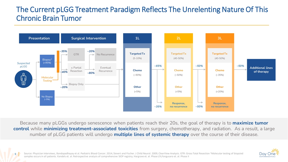 The Current pLGG Treatment Paradigm Reflects The Unrelenting Nature Of This Chronic Brain Tumor 1L 2L 3L Presentation Surgical Intervention ~35% ~20% Targeted Tx Targeted Tx Targeted Tx GTR No Recurrence (5-10%) (40-50%) (40-50%) 1 Biopsy (>95%) Suspected ~65% ~50% ~50% pLGG ≤ Partial Eventual Additional lines Chemo Chemo Chemo Resection Recurrence of therapy ~40% ~80% (~90%) (~50%) (~35%) Molecular Testing Biopsy Only Other Other Other ~20% (<5%) (<5%) (<20%) No Biopsy (~5%) Response, Response, ~35% no recurrence ~50% no recurrence Because many pLGGs undergo senescence when patients reach their 20s, the goal of therapy is to maximize tumor control while minimizing treatment-associated toxicities from surgery, chemotherapy, and radiation. As a result, a large number of pLGG patients will undergo multiple lines of systemic therapy over the course of their disease. 1 Source: Physician Interviews, Bandopadhayay et al. Pediatric Blood Cancer. 2014; Sievert and Fischer. J Child Neurol. 2009; ClearView Analysis. GTR: Gross Total Resection Molecular testing of biopsied 9 samples occurs in all patients. Kandels et. al. Retrospective analysis of comprehensive SIOP registry; Hargrave et. al. Phase I/II;Fangusaro et. al. Phase II
