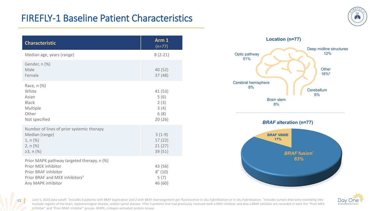 FIREFLY-1 Baseline Patient Characteristics Location (n=77) Arm 1 Characteristic (n=77) Deep midline structures 12% Optic pathway Median age, years (range) 8 (2-21) 51% Gender, n (%) Other Male 40 (52) † 16% Female 37 (48) Cerebral hemisphere Race, n (%) 8% Cerebellum White 41 (53) 6% Asian 5 (6) Brain stem Black 2 (3) 8% Multiple 3 (4) Other 6 (8) Not specified 20 (26) BRAF alteration (n=77) Number of lines of prior systemic therapy Median (range) 3 (1-9) BRAF V600E 17% 1, n (%) 17 (22) 2, n (%) 21 (27) ≥3, n (%) 39 (51) * BRAF fusion 83% Prior MAPK pathway targeted therapy, n (%) Prior MEK inhibitor 43 (56) * Prior BRAF inhibitor 8 (10) ‡ Prior BRAF and MEK inhibitors 5 (7) Any MAPK inhibitor 46 (60) * † June 5, 2023 data cutoff. Includes 6 patients with BRAF duplication and 2 with BRAF rearrangement per fluorescence in situ hybridization or in situ hybridization. Includes tumors that were extending into 12 multiple regions of the brain, leptomeningeal disease, and/or spinal disease. ‡The 5 patients that had previously received both a MEK inhibitor and also a BRAF inhibitor are recorded in both the “Prior MEK inhibitor” and “Prior BRAF inhibitor” groups. MAPK, mitogen-activated protein kinase.