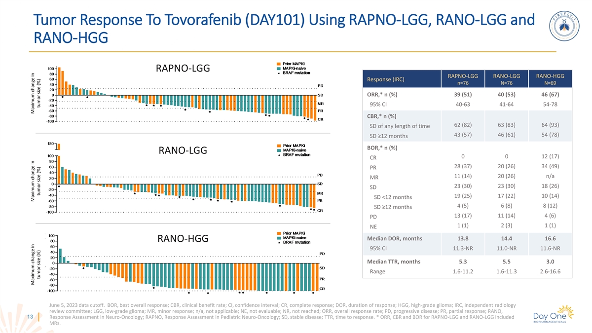 Tumor Response To Tovorafenib (DAY101) Using RAPNO-LGG, RANO-LGG and RANO-HGG RAPNO-LGG RAPNO-LGG RANO-LGG RANO-HGG Response (IRC) n=76 N=76 N=69 ORR,* n (%) 39 (51) 40 (53) 46 (67) 95% CI 40-63 41-64 54-78 CBR,* n (%) 62 (82) 63 (83) 64 (93) SD of any length of time 43 (57) 46 (61) 54 (78) SD ≥12 months BOR,* n (%) RANO-LGG 0 0 12 (17) CR 28 (37) 20 (26) 34 (49) PR 11 (14) 20 (26) n/a MR 23 (30) 23 (30) 18 (26) SD 19 (25) 17 (22) 10 (14) SD <12 months 4 (5) 6 (8) 8 (12) SD ≥12 months 13 (17) 11 (14) 4 (6) PD 1 (1) 2 (3) 1 (1) NE Median DOR, months 13.8 14.4 16.6 RANO-HGG 95% CI 11.3-NR 11.0-NR 11.6-NR Median TTR, months 5.3 5.5 3.0 Range 1.6-11.2 1.6-11.3 2.6-16.6 June 5, 2023 data cutoff. BOR, best overall response; CBR, clinical benefit rate; CI, confidence interval; CR, complete response; DOR, duration of response; HGG, high-grade glioma; IRC, independent radiology review committee; LGG, low-grade glioma; MR, minor response; n/a, not applicable; NE, not evaluable; NR, not reached; ORR, overall response rate; PD, progressive disease; PR, partial response; RANO, 13 Response Assessment in Neuro-Oncology; RAPNO, Response Assessment in Pediatric Neuro-Oncology; SD, stable disease; TTR, time to response. * ORR, CBR and BOR for RAPNO-LGG and RANO-LGG included MRs. Maximum change in Maximum change in Maximum change in tumor size (%) tumor size (%) tumor size (%)