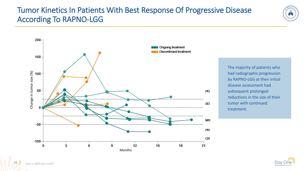 Tumor Kinetics In Patients With Best Response Of Progressive Disease According To RAPNO-LGG The majority of patients who had radiographic progression by RAPNO-LGG at their initial disease assessment had subsequent prolonged reductions in the size of their tumor with continued treatment. Months 15 June 5, 2023 data cutoff. Change in tumor size (%)