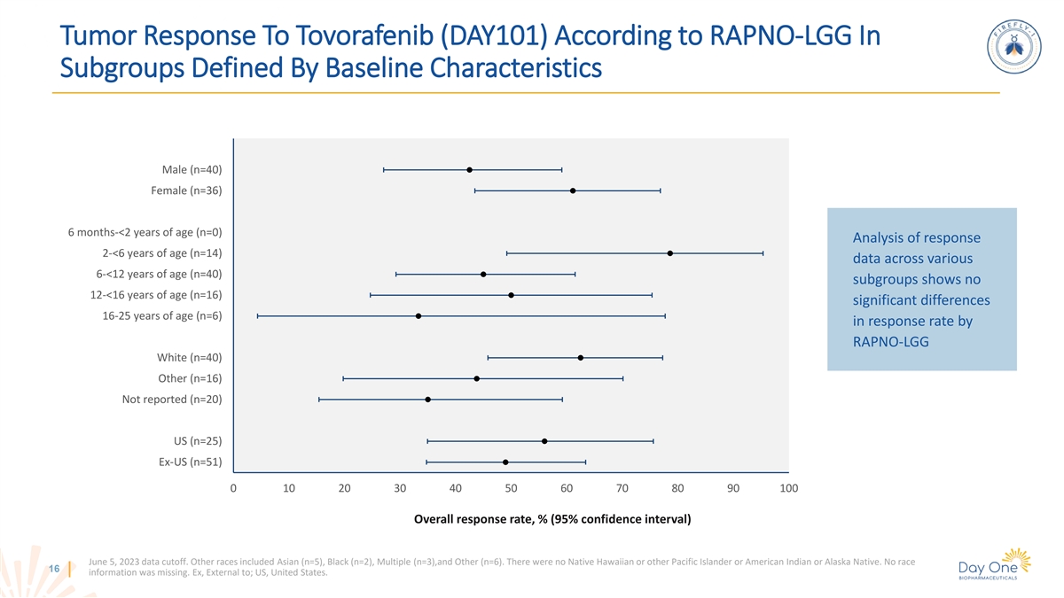 Tumor Response To Tovorafenib (DAY101) According to RAPNO-LGG In Subgroups Defined By Baseline Characteristics Male (n=40) Female (n=36) 6 months-<2 years of age (n=0) Analysis of response 2-<6 years of age (n=14) data across various 6-<12 years of age (n=40) subgroups shows no 12-<16 years of age (n=16) significant differences 16-25 years of age (n=6) in response rate by RAPNO-LGG White (n=40) Other (n=16) Not reported (n=20) US (n=25) Ex-US (n=51) 0 10 20 30 40 50 60 70 80 90 100 Overall response rate, % (95% confidence interval) June 5, 2023 data cutoff. Other races included Asian (n=5), Black (n=2), Multiple (n=3),and Other (n=6). There were no Native Hawaiian or other Pacific Islander or American Indian or Alaska Native. No race 16 information was missing. Ex, External to; US, United States.