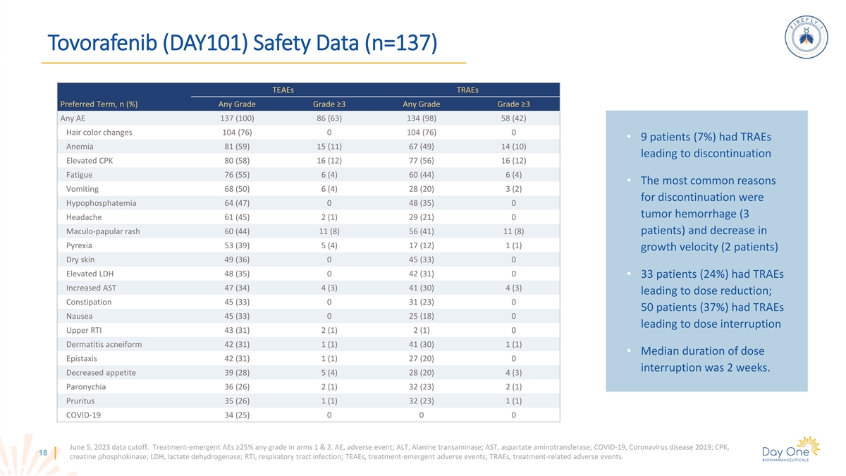 Tovorafenib (DAY101) Safety Data (n=137) TEAEs TRAEs Preferred Term, n (%) Any Grade Grade ≥3 Any Grade Grade ≥3 Any AE 137 (100) 86 (63) 134 (98) 58 (42) Hair color changes 104 (76) 0 104 (76) 0 • 9 patients (7%) had TRAEs Anemia 81 (59) 15 (11) 67 (49) 14 (10) leading to discontinuation Elevated CPK 80 (58) 16 (12) 77 (56) 16 (12) Fatigue 76 (55) 6 (4) 60 (44) 6 (4) • The most common reasons Vomiting 68 (50) 6 (4) 28 (20) 3 (2) for discontinuation were Hypophosphatemia 64 (47) 0 48 (35) 0 tumor hemorrhage (3 Headache 61 (45) 2 (1) 29 (21) 0 Maculo-papular rash 60 (44) 11 (8) 56 (41) 11 (8) patients) and decrease in Pyrexia 53 (39) 5 (4) 17 (12) 1 (1) growth velocity (2 patients) Dry skin 49 (36) 0 45 (33) 0 Elevated LDH 48 (35) 0 42 (31) 0 • 33 patients (24%) had TRAEs Increased AST 47 (34) 4 (3) 41 (30) 4 (3) leading to dose reduction; Constipation 45 (33) 0 31 (23) 0 50 patients (37%) had TRAEs Nausea 45 (33) 0 25 (18) 0 leading to dose interruption Upper RTI 43 (31) 2 (1) 2 (1) 0 Dermatitis acneiform 42 (31) 1 (1) 41 (30) 1 (1) • Median duration of dose Epistaxis 42 (31) 1 (1) 27 (20) 0 interruption was 2 weeks. Decreased appetite 39 (28) 5 (4) 28 (20) 4 (3) Paronychia 36 (26) 2 (1) 32 (23) 2 (1) Pruritus 35 (26) 1 (1) 32 (23) 1 (1) COVID-19 34 (25) 0 0 0 June 5, 2023 data cutoff. Treatment-emergent AEs ≥25% any grade in arms 1 & 2. AE, adverse event; ALT, Alanine transaminase; AST, aspartate aminotransferase; COVID-19, Coronavirus disease 2019; CPK, 18 creatine phosphokinase; LDH, lactate dehydrogenase; RTI, respiratory tract infection; TEAEs, treatment-emergent adverse events; TRAEs, treatment-related adverse events.