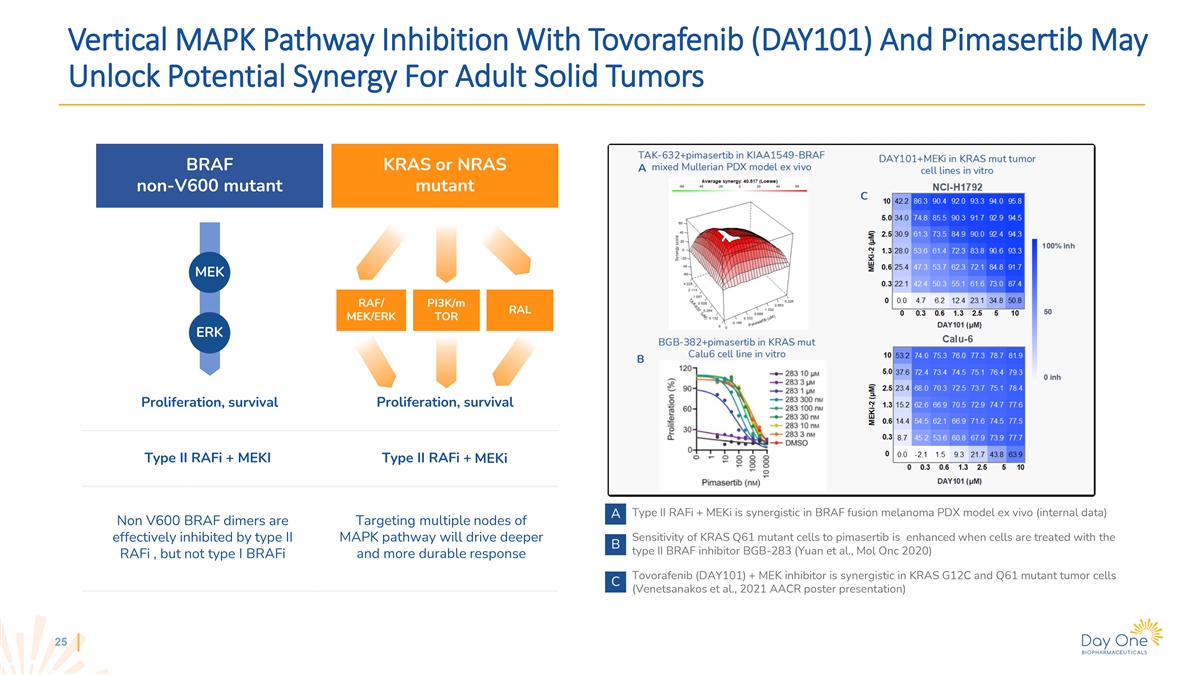 Pimasertib: Investigational Allosteric MEK1/2 Inhibitor With Demonstrated Activity In MAPK-Driven Solid Tumors • Pimasertib is an investigational orally-bioavailable, selective, non-competitive MEK1/2 inhibitor in-licensed from Merck KGaA in February 2021 • Extensive non-clinical and clinical development work through Phase 2, including a solid tumor trial in Japan and combinations with other MOAs • Main AEs typical for all in-class allosteric MEK inhibitors (GI, CPK elevation, skin rash, visual disturbances) • Nearly three-fold higher CNS penetration than other MEKi inhibitors (trametinib or selumetinib) • Pimasertib showed monotherapy clinical activity, including an improvement in median PFS versus dacarbazine in NRAS mutant melanoma • Combination with tovorafenib (DAY101) and other targeted therapies may unlock the full value of pimasertib in advanced solid tumors 24 Sources: Pimasertib Investigator Brochure, v12, 2019; de Gooijer et al., Int J Cancer, 2018; Shaw et al., AACR LB-456, 2012; Lebbe et al., Cancers, 2020.