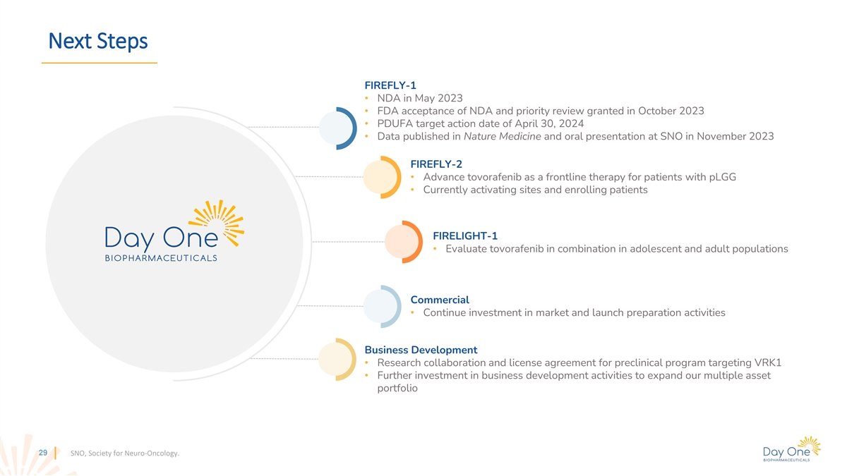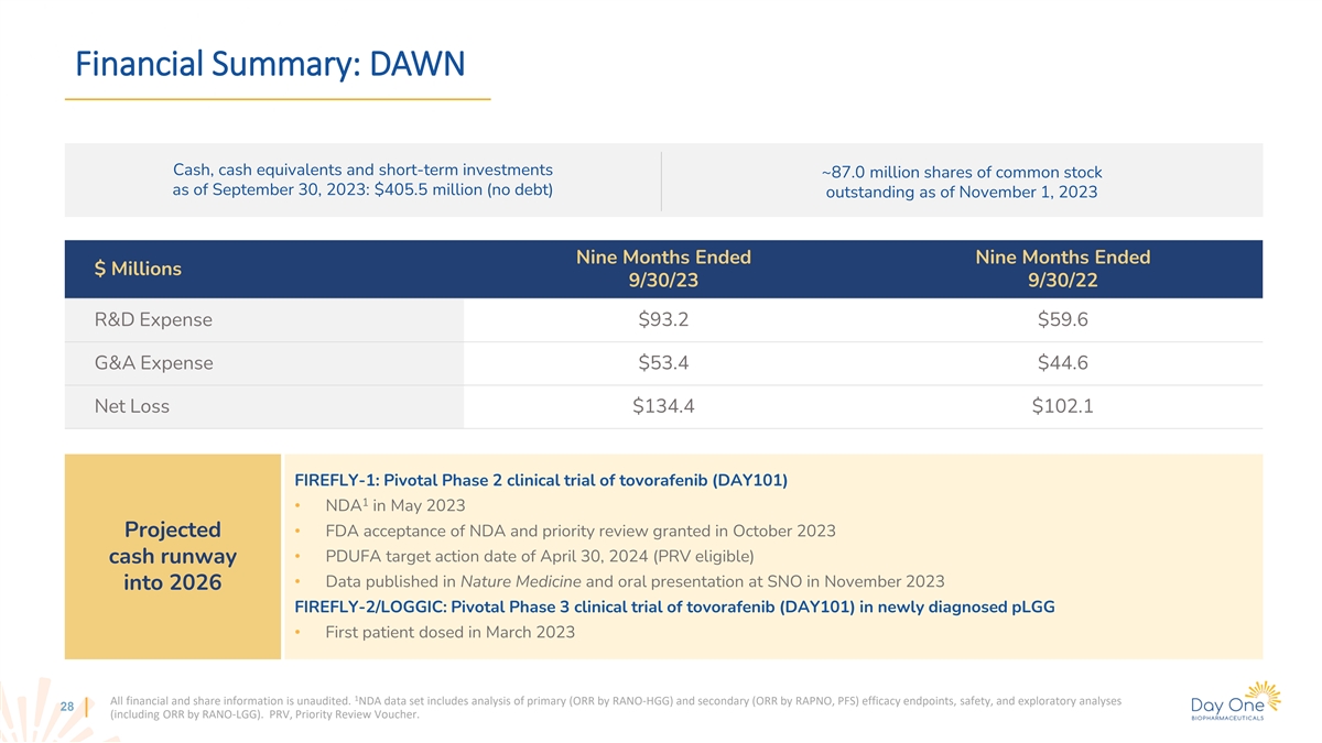 Financial Summary: DAWN Cash, cash equivalents and short-term investments ~87.0 million shares of common stock as of September 30, 2023: $405.5 million (no debt) outstanding as of November 1, 2023 Nine Months Ended Nine Months Ended $ Millions 9/30/23 9/30/22 R&D Expense $93.2 $59.6 G&A Expense $53.4 $44.6 Net Loss $134.4 $102.1 FIREFLY-1: Pivotal Phase 2 clinical trial of tovorafenib (DAY101) 1 • NDA in May 2023 Projected • FDA acceptance of NDA and priority review granted in October 2023 • PDUFA target action date of April 30, 2024 (PRV eligible) cash runway • Data published in Nature Medicine and oral presentation at SNO in November 2023 into 2026 FIREFLY-2/LOGGIC: Pivotal Phase 3 clinical trial of tovorafenib (DAY101) in newly diagnosed pLGG • First patient dosed in March 2023 1 All financial and share information is unaudited. NDA data set includes analysis of primary (ORR by RANO-HGG) and secondary (ORR by RAPNO, PFS) efficacy endpoints, safety, and exploratory analyses 28 (including ORR by RANO-LGG). PRV, Priority Review Voucher.