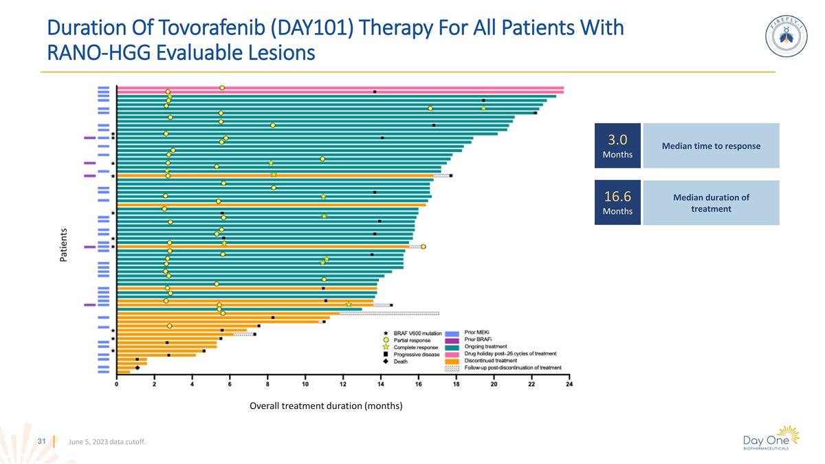 Duration Of Tovorafenib (DAY101) Therapy For All Patients With RANO-HGG Evaluable Lesions 3.0 Median time to response Months Median duration of 16.6 treatment Months Overall treatment duration (months) 31 June 5, 2023 data cutoff. Patients