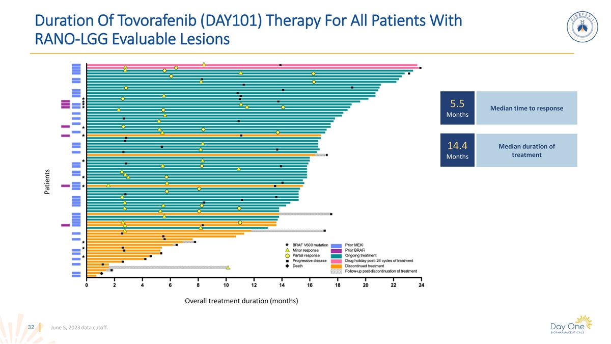 Duration Of Tovorafenib (DAY101) Therapy For All Patients With RANO-LGG Evaluable Lesions 5.5 Median time to response Months Median duration of 14.4 treatment Months Overall treatment duration (months) 32 June 5, 2023 data cutoff. Patients