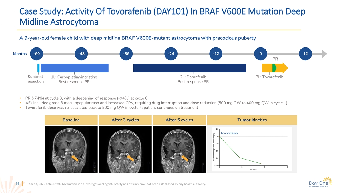 Case Study: Activity Of Tovorafenib (DAY101) In KIAA1549-BRAF Fusion Posterior Fossa Pilocytic Astrocytoma An 8-years-old female child with a posterior fossa pilocytic astrocytoma, eczema, nausea and constipation Months -84 -72 -60 -48 -36 -24 -12 0 12 PR Suboccipital 2L: Carboplatin/vincristine craniotomies 4L: Trametinib 5L: Tovorafenib Best response PR Best response SD 1L: Carboplatin 3L: Vinblastine Best response PD Best response SD • PR (-69%) at cycle 3 with 500 mg QW tovorafenib, with a deepening of response (80% and 91% in cycles 6 and 9, respectively) over time • AEs included grade 2 decrease in neutrophil count, pustular rash, and upper respiratory infection • Patient continues to receive weekly tovorafenib Baseline After 3 cycles After 6 cycles After 9 cycles Tumor kinetics Tovorafenib 34 Apr 14, 2022 data cutoff. Tovorafenib is an investigational agent. Safety and efficacy have not been established by any health authority.