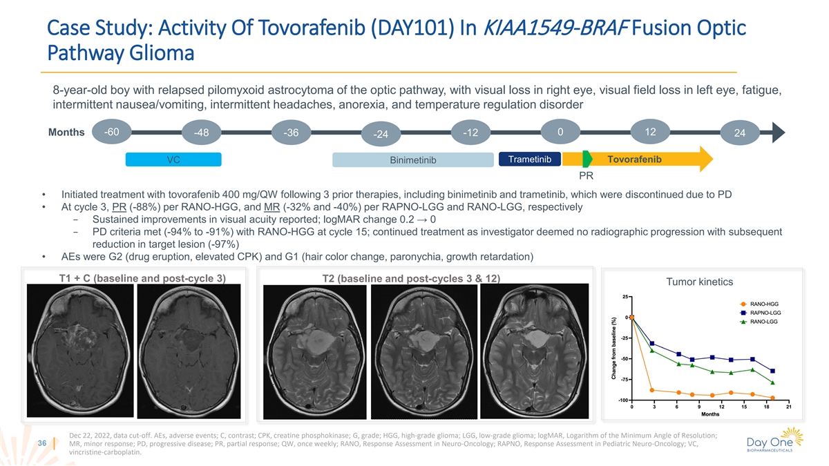 Case Study: Activity Of Tovorafenib (DAY101) In KIAA1549-BRAF Fusion Optic Pathway Glioma 8-year-old boy with relapsed pilomyxoid astrocytoma of the optic pathway, with visual loss in right eye, visual field loss in left eye, fatigue, intermittent nausea/vomiting, intermittent headaches, anorexia, and temperature regulation disorder Months -60 0 12 -48 -36 -12 24 -24 Trametinib VC Binimetinib Tovorafenib PR • Initiated treatment with tovorafenib 400 mg/QW following 3 prior therapies, including binimetinib and trametinib, which were discontinued due to PD • At cycle 3, PR (-88%) per RANO-HGG, and MR (-32% and -40%) per RAPNO-LGG and RANO-LGG, respectively − Sustained improvements in visual acuity reported; logMAR change 0.2 → 0 − PD criteria met (-94% to -91%) with RANO-HGG at cycle 15; continued treatment as investigator deemed no radiographic progression with subsequent reduction in target lesion (-97%) • AEs were G2 (drug eruption, elevated CPK) and G1 (hair color change, paronychia, growth retardation) T1 + C (baseline and post-cycle 3) T2 (baseline and post-cycles 3 & 12) Tumor kinetics Dec 22, 2022, data cut-off. AEs, adverse events; C, contrast; CPK, creatine phosphokinase; G, grade; HGG, high-grade glioma; LGG, low-grade glioma; logMAR, Logarithm of the Minimum Angle of Resolution; 36 MR, minor response; PD, progressive disease; PR, partial response; QW, once weekly; RANO, Response Assessment in Neuro-Oncology; RAPNO, Response Assessment in Pediatric Neuro-Oncology; VC, vincristine-carboplatin.