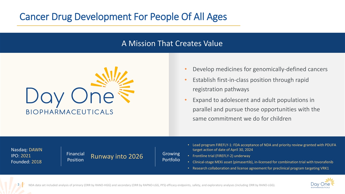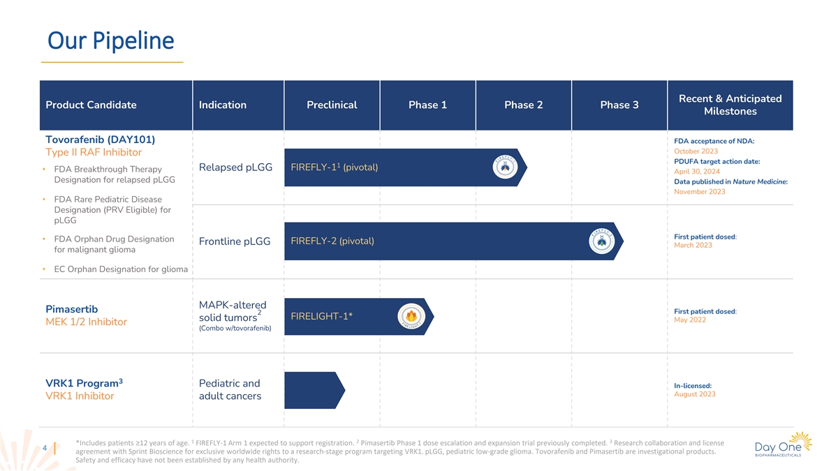Cancer Drug Development For People Of All Ages A Mission That Creates Value • Develop medicines for genomically-defined cancers • Establish first-in-class position through rapid registration pathways • Expand to adolescent and adult populations in parallel and pursue those opportunities with the same commitment we do for children • Lead program FIREFLY-1: FDA acceptance of NDA and priority review granted with PDUFA target action of date of April 30, 2024 Nasdaq: DAWN Growing Financial • Frontline trial (FIREFLY-2) underway IPO: 2021 Runway into 2026 Position Portfolio Founded: 2018 • Clinical-stage MEKi asset (pimasertib), in-licensed for combination trial with tovorafenib • Research collaboration and license agreement for preclinical program targeting VRK1 3 NDA data set included analysis of primary (ORR by RANO-HGG) and secondary (ORR by RAPNO-LGG, PFS) efficacy endpoints, safety, and exploratory analyses (including ORR by RANO-LGG).