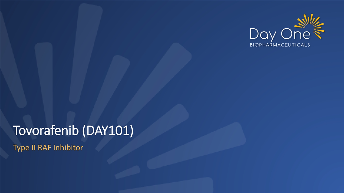 Our Pipeline Recent & Anticipated Product Candidate Indication Preclinical Phase 1 Phase 2 Phase 3 Milestones Tovorafenib (DAY101) FDA acceptance of NDA: October 2023 Type II RAF Inhibitor PDUFA target action date: 1 Relapsed pLGG FIREFLY-1 (pivotal) • FDA Breakthrough Therapy April 30, 2024 Designation for relapsed pLGG Data published in Nature Medicine: November 2023 • FDA Rare Pediatric Disease Designation (PRV Eligible) for pLGG First patient dosed: • FDA Orphan Drug Designation FIREFLY-2 (pivotal) Frontline pLGG March 2023 for malignant glioma • EC Orphan Designation for glioma MAPK-altered Pimasertib First patient dosed: 2 FIRELIGHT-1* solid tumors May 2022 MEK 1/2 Inhibitor (Combo w/tovorafenib) 3 VRK1 Program Pediatric and In-licensed: August 2023 VRK1 Inhibitor adult cancers 1 2 3 *Includes patients ≥12 years of age. FIREFLY-1 Arm 1 expected to support registration. Pimasertib Phase 1 dose escalation and expansion trial previously completed. Research collaboration and license 4 agreement with Sprint Bioscience for exclusive worldwide rights to a research-stage program targeting VRK1. pLGG, pediatric low-grade glioma. Tovorafenib and Pimasertib are investigational products. Safety and efficacy have not been established by any health authority.