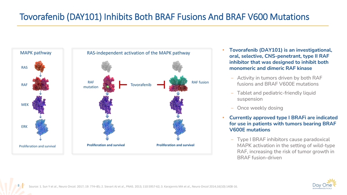 Tovorafenib (DAY101) Inhibits Both BRAF Fusions And BRAF V600 Mutations • Tovorafenib (DAY101) is an investigational, MAPK pathway RAS-independent activation of the MAPK pathway oral, selective, CNS-penetrant, type II RAF inhibitor that was designed to inhibit both RAS monomeric and dimeric RAF kinase ‒ Activity in tumors driven by both RAF RAF RAF fusion fusions and BRAF V600E mutations RAF Tovorafenib mutation ‒ Tablet and pediatric-friendly liquid suspension MEK ‒ Once weekly dosing • Currently approved type I BRAFi are indicated for use in patients with tumors bearing BRAF ERK V600E mutations ‒ Type I BRAF inhibitors cause paradoxical Proliferation and survival Proliferation and survival Proliferation and survival MAPK activation in the setting of wild-type RAF, increasing the risk of tumor growth in BRAF fusion-driven 8 Source: 1. Sun Y et al., Neuro Oncol. 2017; 19: 774–85; 2. Sievart AJ et al., PNAS. 2013; 110:5957-62; 3. Karajannis MA et al., Neuro Oncol 2014;16(10):1408-16.