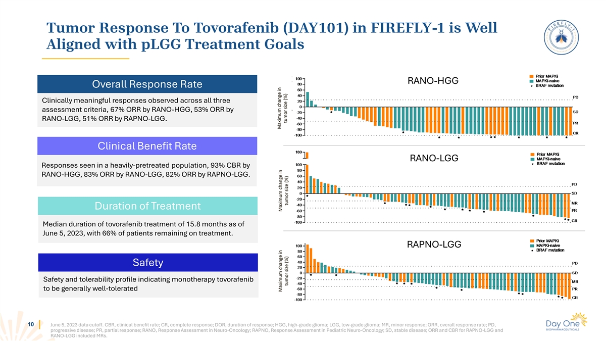 Tumor Response To Tovorafenib (DAY101) in FIREFLY-1 is Well Aligned with pLGG Treatment Goals RANO-HGG Overall Response Rate Clinically meaningful responses observed across all three assessment criteria, 67% ORR by RANO-HGG, 53% ORR by RANO-LGG, 51% ORR by RAPNO-LGG. Clinical Benefit Rate RANO-LGG Responses seen in a heavily-pretreated population, 93% CBR by RANO-HGG, 83% ORR by RANO-LGG, 82% ORR by RAPNO-LGG. Duration of Treatment Median duration of tovorafenib treatment of 15.8 months as of June 5, 2023, with 66% of patients remaining on treatment. RAPNO-LGG Safety Safety and tolerability profile indicating monotherapy tovorafenib to be generally well-tolerated 10 June 5, 2023 data cutoff. CBR, clinical benefit rate; CR, complete response; DOR, duration of response; HGG, high-grade glioma; LGG, low-grade glioma; MR, minor response; ORR, overall response rate; PD, progressive disease; PR, partial response; RANO, Response Assessment in Neuro-Oncology; RAPNO, Response Assessment in Pediatric Neuro-Oncology; SD, stable disease; ORR and CBR for RAPNO-LGG and RANO-LGG included MRs. Maximum change in Maximum change in Maximum change in tumor size (%) tumor size (%) tumor size (%)