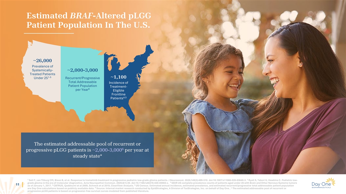 Estimated BRAF-Altered pLGG Patient Population In The U.S. ~26,000 Prevalence of Systemically- ~2,000-3,000 Treated Patients 1-5 ~1,100 Under 25 Recurrent/Progressive Total Addressable Incidence of Patient Population Treatment- 6 per Year Eligible Frontline 4,5 Patients The estimated addressable pool of recurrent or 6 progressive pLGG patients is ~2,000-3,000 per year at steady state* 1 2 Selt F, van Tilburg CM, Bison B, et al. Response to trametinib treatment in progressive pediatric low-grade glioma patients. J Neurooncol. 2020;149(3):499-510. doi:10.1007/s11060-020-03640-3. Ryall S, Tabori U, Hawkins C. Pediatric low- 3 grade glioma in the era of molecular diagnostics. Acta Neuropathol Commun. 2020;8(1):30. doi:10.1186/s40478-020-00902-z. SEER US complete prevalence counts of patients aged under 25 with Brain and Other Nervous Systems tumors 11 4 5 as of January 1, 2017. CBTRUS, Qaddoumi et al 2009, Schreck et al 2019, ClearView Analysis. US Census. Estimated annual incidence, estimated prevalence, and estimated recurrent/progressive total addressable patient population 6 are Day One calculations based on publicly available data. Source: Internal market research conducted by EpidStrategies, A Division of ToxStrategies, Inc. on behalf of Day One , * The estimated addressable pool of recurrent or progressive pLGG patients is based on progression free survival curves modeled from published literature.