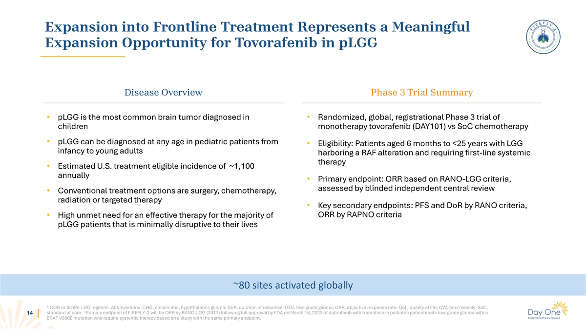 FIREFLY-2 Pivotal Phase 3 Trial of Tovorafenib (DAY101) in Frontline pLGG 13