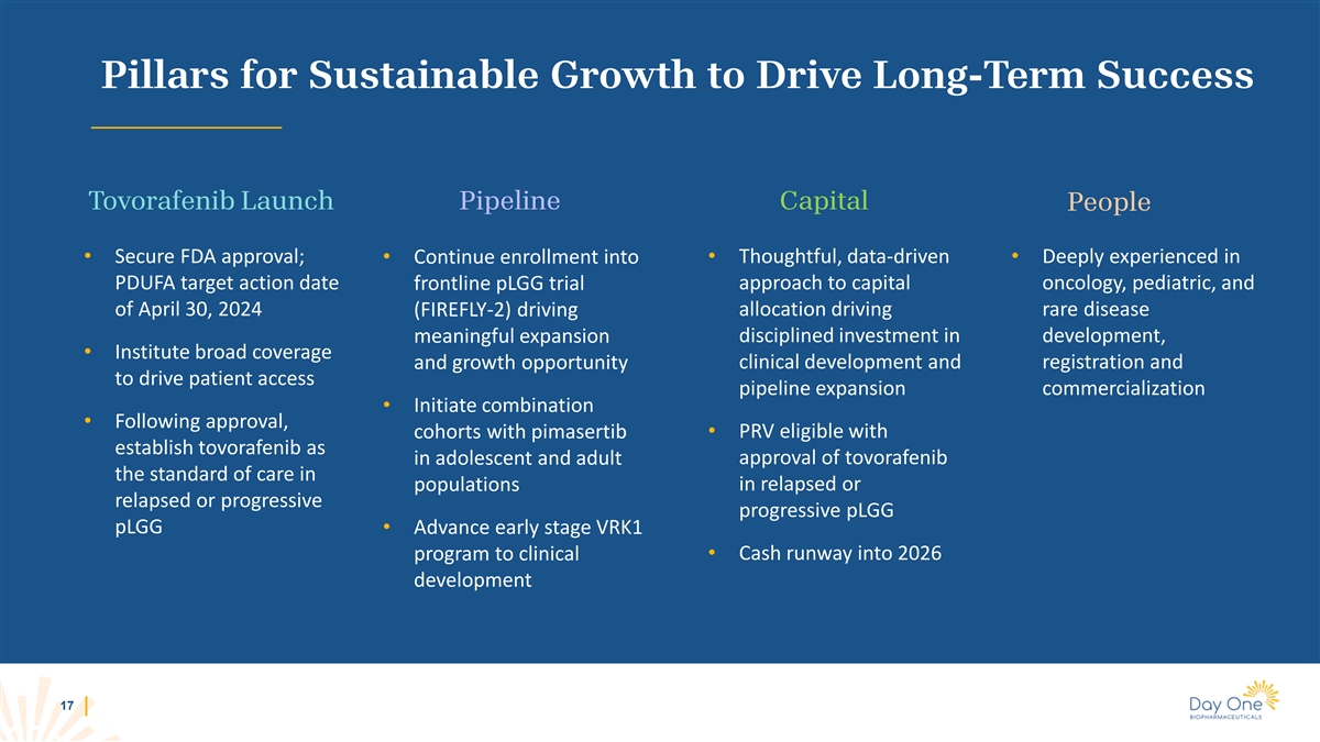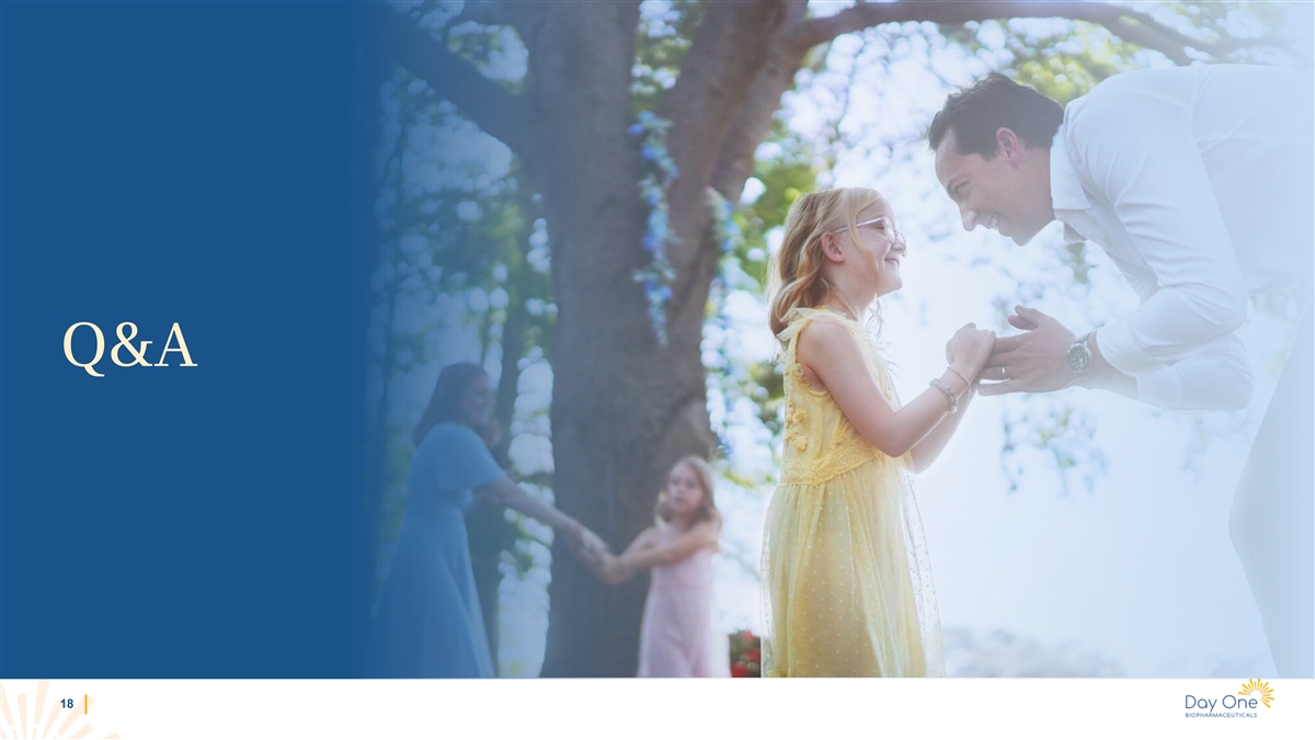 Pillars for Sustainable Growth to Drive Long-Term Success Tovorafenib Launch Pipeline Capital People • Secure FDA approval; • Continue enrollment into • Thoughtful, data-driven • Deeply experienced in PDUFA target action date frontline pLGG trial approach to capital oncology, pediatric, and of April 30, 2024 (FIREFLY-2) driving allocation driving rare disease disciplined investment in development, meaningful expansion • Institute broad coverage clinical development and registration and and growth opportunity to drive patient access pipeline expansion commercialization • Initiate combination • Following approval, cohorts with pimasertib • PRV eligible with establish tovorafenib as in adolescent and adult approval of tovorafenib the standard of care in in relapsed or populations relapsed or progressive progressive pLGG pLGG • Advance early stage VRK1 program to clinical • Cash runway into 2026 development 17
