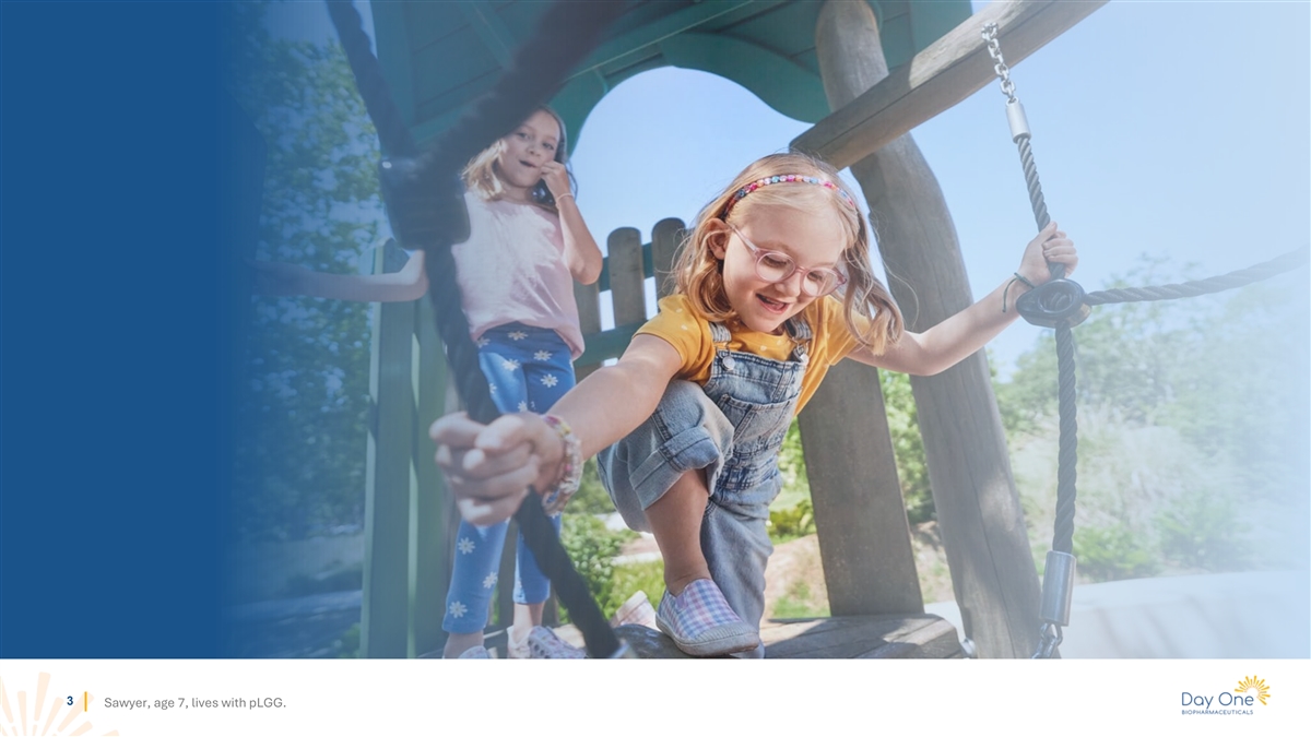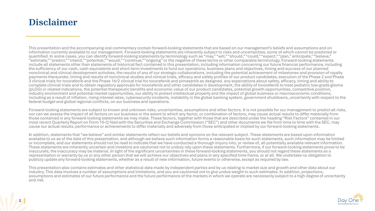 Disclaimer This presentation and the accompanying oral commentary contain forward-looking statements that are based on our management’s beliefs and assumptions and on information currently available to our management. Forward-looking statements are inherently subject to risks and uncertainties, some of which cannot be predicted or quantified. In some cases, you can identify forward-looking statements by terminology such as “may,” “will,” “should,” “could,” “expect, ” “plan, ” anticipate, ” “believe, ” “estimate,” “predict,” “intend,” “potential,” “would,” “continue,” “ongoing” or the negative of these terms or other comparable terminology. Forward-looking statements include all statements other than statements of historical fact contained in this presentation, including information concerning our future financial performance, including the sufficiency of our cash, cash equivalents and short-term investments to fund our operations, business plans and objectives, timing and success of our planned nonclinical and clinical development activities, the results of any of our strategic collaborations, including the potential achievement of milestones and provision of royalty payments thereunder, timing and results of nonclinical studies and clinical trials, efficacy and safety profiles of our product candidates, execution of the Phase 2 and Phase 3 clinical trials for tovorafenib and the Phase 1b/2 clinical trial for tovorafenib and pimasertib as designed, any expectations about safety, efficacy, timing and ability to complete clinical trials and to obtain regulatory approvals for tovorafenib and other candidates in development, the ability of tovorafenib to treat pediatric low-grade glioma (pLGG) or related indications, the potential therapeutic benefits and economic value of our product candidates, potential growth opportunities, competitive position, industry environment and potential market opportunities, our ability to protect intellectual property and the impact of global business or macroeconomic conditions, including as a result of inflation, rising interest rates, cybersecurity incidents, instability in the global banking system, government shutdowns, uncertainty with respect to the federal budget and global regional conflicts, on our business and operations. Forward-looking statements are subject to known and unknown risks, uncertainties, assumptions and other factors. It is not possible for our management to predict all risks, nor can we assess the impact of all factors on our business or the extent to which any factor, or combination of factors, may cause actual results to differ materially from those contained in any forward-looking statements we may make. These factors, together with those that are described under the heading “Risk Factors” contained in our most recent Quarterly Report on Form 10-Q filed with the Securities and Exchange Commission (“SEC”) and other documents we file from time to time with the SEC, may cause our actual results, performance or achievements to differ materially and adversely from those anticipated or implied by our forward-looking statements. In addition, statements that “we believe” and similar statements reflect our beliefs and opinions on the relevant subject. These statements are based upon information available to us as of the date of this presentation, and although we believe such information forms a reasonable basis for such statements, such information may be limited or incomplete, and our statements should not be read to indicate that we have conducted a thorough inquiry into, or review of, all potentially available relevant information. These statements are inherently uncertain and investors are cautioned not to unduly rely upon these statements. Furthermore, if our forward-looking statements prove to be inaccurate, the inaccuracy may be material. In light of the significant uncertainties in these forward-looking statements, you should not regard these statements as a representation or warranty by us or any other person that we will achieve our objectives and plans in any specified time frame, or at all. We undertake no obligation to publicly update any forward-looking statements, whether as a result of new information, future events or otherwise, except as required by law. This presentation also contains estimates and other statistical data made by independent parties and by us relating to market size and growth and other data about our industry. This data involves a number of assumptions and limitations, and you are cautioned not to give undue weight to such estimates. In addition, projections, assumptions and estimates of our future performance and the future performance of the markets in which we operate are necessarily subject to a high degree of uncertainty and risk. 2