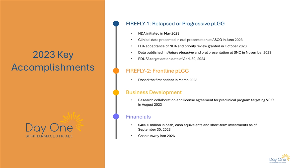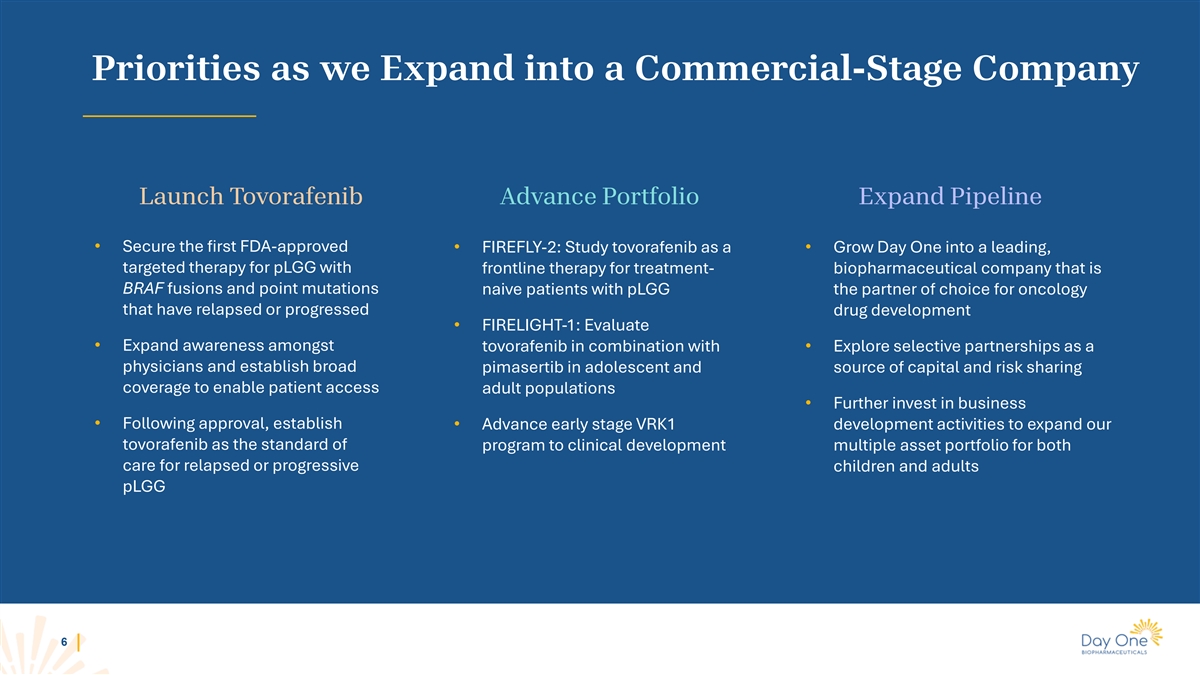 FIREFLY-1: Relapsed or Progressive pLGG • NDA initiated in May 2023 • Clinical data presented in oral presentation at ASCO in June 2023 • FDA acceptance of NDA and priority review granted in October 2023 • Data published in Nature Medicine and oral presentation at SNO in November 2023 2023 Key • PDUFA target action date of April 30, 2024 Accomplishments FIREFLY-2: Frontline pLGG • Dosed the first patient in March 2023 Business Development • Research collaboration and license agreement for preclinical program targeting VRK1 in August 2023 Financials • $405.5 million in cash, cash equivalents and short-term investments as of September 30, 2023 • Cash runway into 2026 5