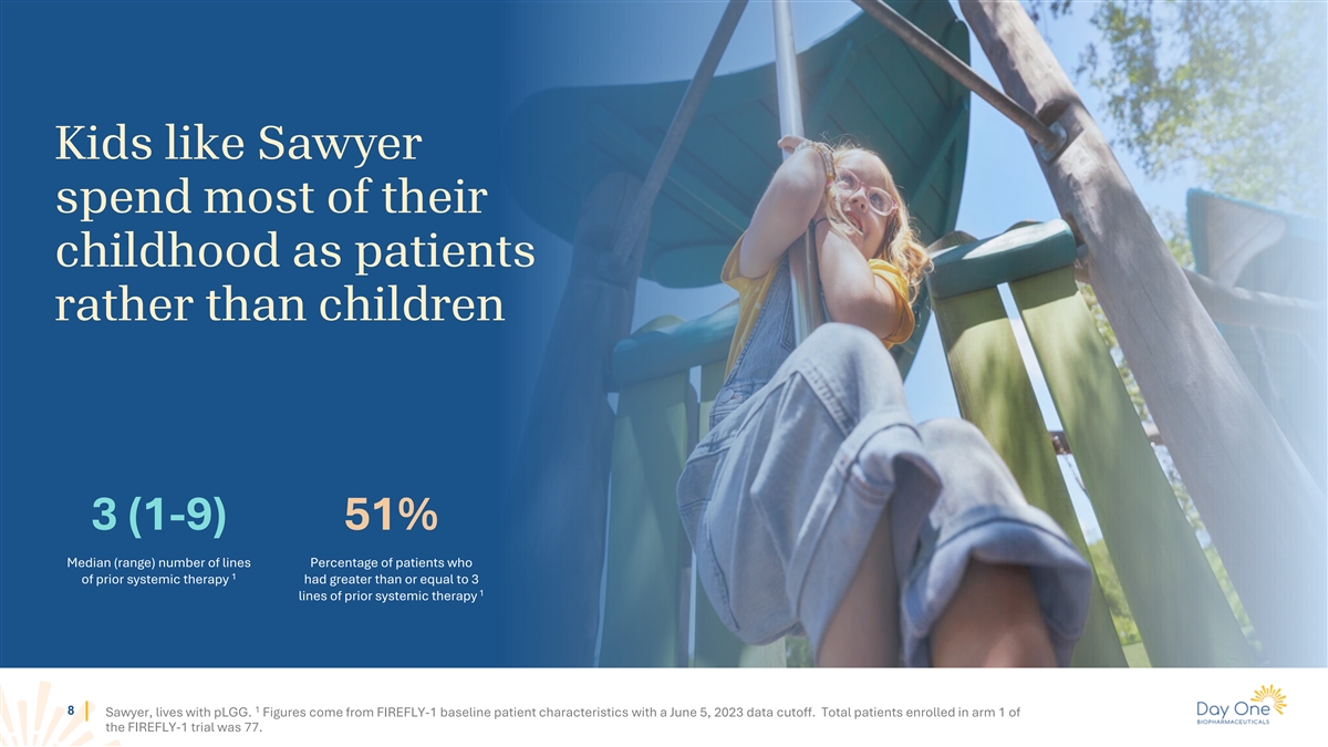 Kids like Sawyer spend most of their childhood as patients rather than children 3 (1-9) 51% Median (range) number of lines Percentage of patients who 1 of prior systemic therapy had greater than or equal to 3 1 lines of prior systemic therapy 1 8 Sawyer, lives with pLGG. Figures come from FIREFLY-1 baseline patient characteristics with a June 5, 2023 data cutoff. Total patients enrolled in arm 1 of the FIREFLY-1 trial was 77.
