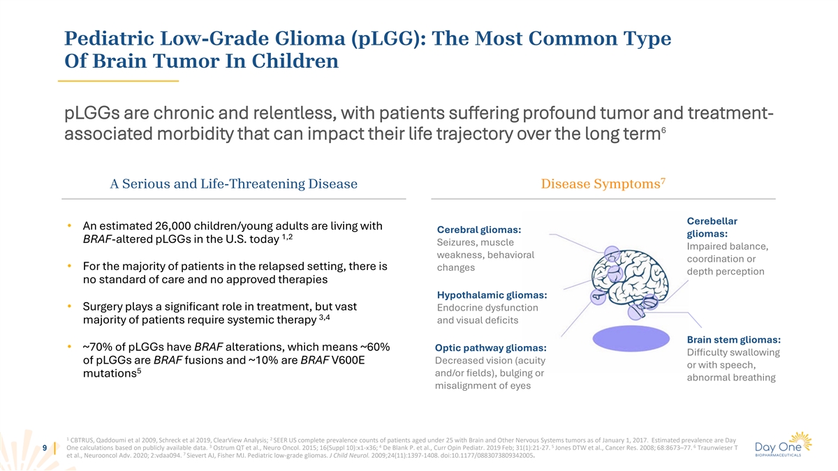 Pediatric Low-Grade Glioma (pLGG): The Most Common Type Of Brain Tumor In Children pLGGs are chronic and relentless, with patients suffering profound tumor and treatment- 6 associated morbidity that can impact their life trajectory over the long term 7 A Serious and Life-Threatening Disease Disease Symptoms Cerebellar • An estimated 26,000 children/young adults are living with Cerebral gliomas: gliomas: 1,2 BRAF-altered pLGGs in the U.S. today Seizures, muscle Impaired balance, weakness, behavioral coordination or • For the majority of patients in the relapsed setting, there is changes depth perception no standard of care and no approved therapies Hypothalamic gliomas: • Surgery plays a significant role in treatment, but vast Endocrine dysfunction 3,4 majority of patients require systemic therapy and visual deficits Brain stem gliomas: • ~70% of pLGGs have BRAF alterations, which means ~60% Optic pathway gliomas: Difficulty swallowing of pLGGs are BRAF fusions and ~10% are BRAF V600E Decreased vision (acuity or with speech, 5 mutations and/or fields), bulging or abnormal breathing misalignment of eyes 1 2 CBTRUS, Qaddoumi et al 2009, Schreck et al 2019, ClearView Analysis; SEER US complete prevalence counts of patients aged under 25 with Brain and Other Nervous Systems tumors as of January 1, 2017. Estimated prevalence are Day 3 4 5 6 One calculations based on publicly available data. Ostrum QT et al., Neuro Oncol. 2015; 16(Suppl 10):x1-x36; De Blank P. et al., Curr Opin Pediatr. 2019 Feb; 31(1):21-27. Jones DTW et al., Cancer Res. 2008; 68:8673–77. Traunwieser T 9 7 et al., Neurooncol Adv. 2020; 2:vdaa094. Sievert AJ, Fisher MJ. Pediatric low-grade gliomas. J Child Neurol. 2009;24(11):1397-1408. doi:10.1177/0883073809342005.