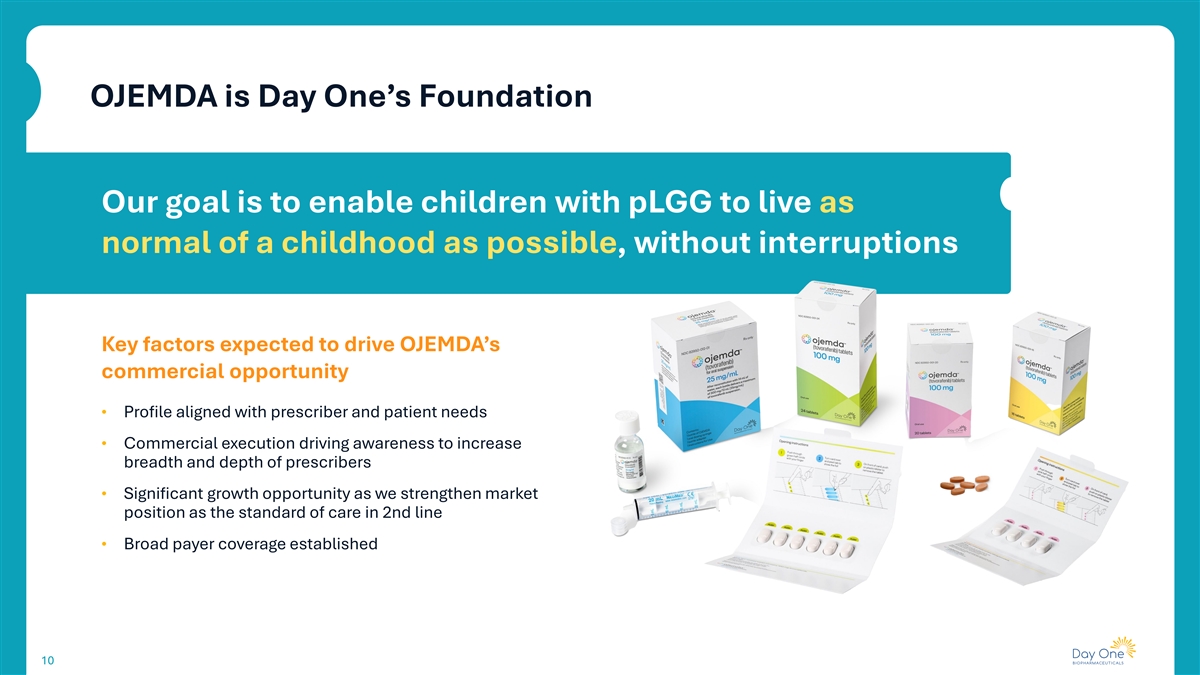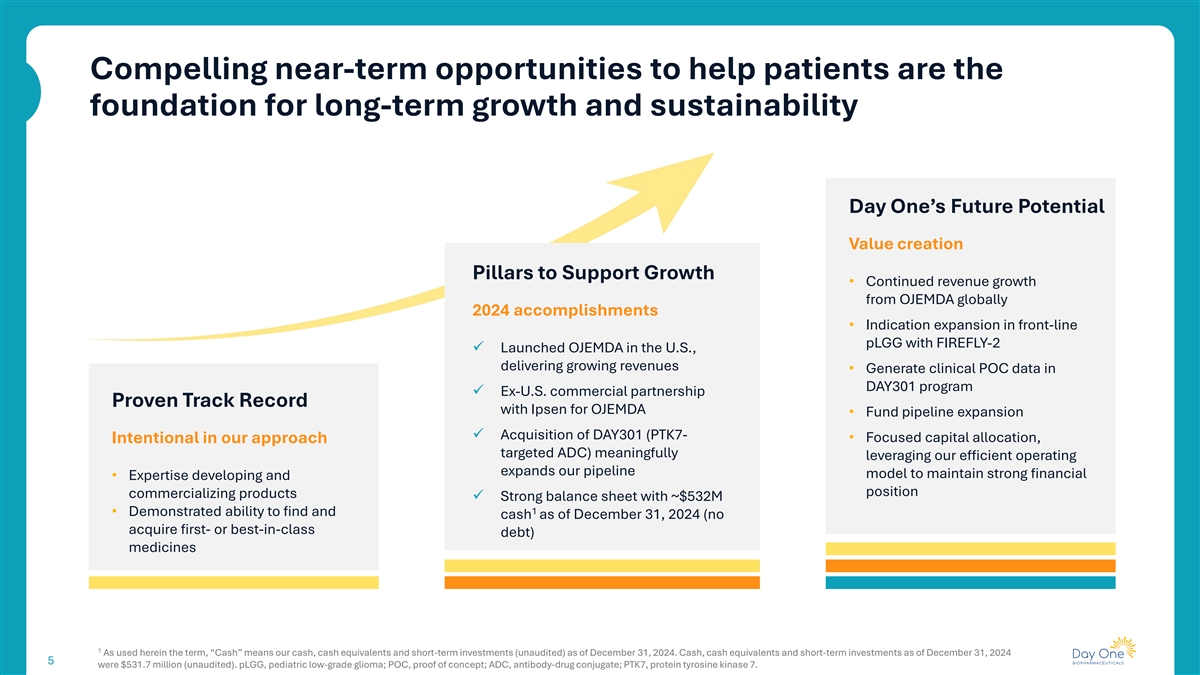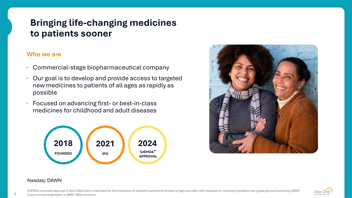 Bringing life-changing medicines to patients sooner Who we are • Commercial-stage biopharmaceutical company • Our goal is to develop and provide access to targeted new medicines to patients of all ages as rapidly as possible • Focused on advancing first- or best-in-class medicines for childhood and adult diseases 2018 2024 2021 TM OJEMDA FOUNDED IPO APPROVAL Nasdaq: DAWN OJEMDA received approval in April 2024 and is indicated for the treatment of pediatric patients 6 months of age and older with relapsed or refractory pediatric low-grade glioma harboring a BRAF 4 fusion or rearrangement, or BRAF V600 mutation.