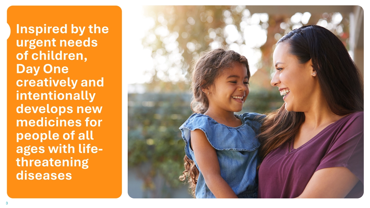 Inspired by the urgent needs of children, Day One creatively and intentionally develops new medicines for people of all ages with life- threatening diseases 3