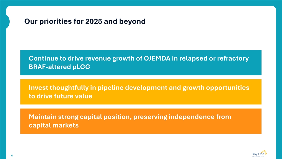 Compelling near-term opportunities to help patients are the foundation for long-term growth and sustainability Day One’s Future Potential Value creation Pillars to Support Growth • Continued revenue growth from OJEMDA globally 2024 accomplishments • Indication expansion in front-line pLGG with FIREFLY-2 ü Launched OJEMDA in the U.S., delivering growing revenues • Generate clinical POC data in DAY301 program ü Ex-U.S. commercial partnership Proven Track Record with Ipsen for OJEMDA • Fund pipeline expansion ü Acquisition of DAY301 (PTK7- • Focused capital allocation, Intentional in our approach targeted ADC) meaningfully leveraging our efficient operating expands our pipeline model to maintain strong financial • Expertise developing and position commercializing products ü Strong balance sheet with ~$532M 1 • Demonstrated ability to find and cash as of December 31, 2024 (no acquire first- or best-in-class debt) medicines 1 As used herein the term, “Cash” means our cash, cash equivalents and short-term investments (unaudited) as of December 31, 2024. Cash, cash equivalents and short-term investments as of December 31, 2024 5 were $531.7 million (unaudited). pLGG, pediatric low-grade glioma; POC, proof of concept; ADC, antibody-drug conjugate; PTK7, protein tyrosine kinase 7.