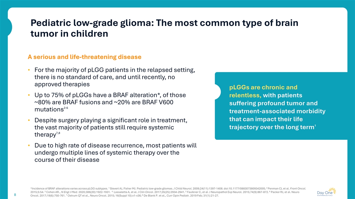 Pediatric low-grade glioma: The most common type of brain tumor in children A serious and life-threatening disease • For the majority of pLGG patients in the relapsed setting, there is no standard of care, and until recently, no approved therapies pLGGs are chronic and • Up to 75% of pLGGs have a BRAF alteration*, of those relentless, with patients ~80% are BRAF fusions and ~20% are BRAF V600 suffering profound tumor and 2-6 mutations treatment-associated morbidity that can impact their life • Despite surgery playing a significant role in treatment, 1 the vast majority of patients still require systemic trajectory over the long term 7,8 therapy • Due to high rate of disease recurrence, most patients will undergo multiple lines of systemic therapy over the course of their disease 1 2 *Incidence of BRAF alterations varies across pLGG subtypes. Sievert AJ, Fisher MJ. Pediatric low-grade gliomas. J Child Neurol. 2009;24(11):1397-1408. doi:10.1177/0883073809342005. Penman CL et al. Front Oncol. 3 4 5 6 2015;5:54. Cohen AR., N Engl J Med. 2020;386(20):1922-1931. Lassaletta A, et al. J Clin Oncol. 2017;35(25):2934-2941. Faulkner C, et al. J Neuropathol Exp Neurol. 2015;74(9):867-872. Packer RJ, et al. Neuro 7 8 8 Oncol. 2017;19(6):750-761. Ostrum QT et al., Neuro Oncol. 2015; 16(Suppl 10):x1-x36; De Blank P. et al., Curr Opin Pediatr. 2019 Feb; 31(1):21-27.