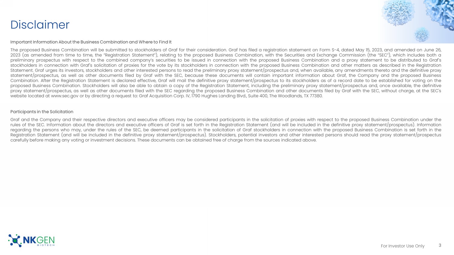 For Investor Use Only Disclaimer Disclosures This investor presentation (this “Presentation”) has been prepared by NKGen Biotech, Inc . (“ NKGen ,” “ NKGen Biotech” or the “Company”) for informational purposes only and to assist interested parties in making their own evaluation with respect to the business combination (the “Business Combination”) between the Company and Graf Acquisition Corp . IV (“Graf”) and related transactions and not for any other purpose . Nothing contained in this Presentation is or should be construed as a recommendation promise or representation by the presenter, Graf or the Company or any officer director employee agent or advisor of the Company or Graf . This Presentation shall not constitute ( i ) a solicitation of a proxy, consent or authorization with respect to any securities or in respect of the Business Combination or (ii) an offer to sell or the solicitation of an offer to buy securities, nor shall there be any sale of securities in any state or jurisdiction in which such offer, solicitation or sale would be unlawful prior to registration or qualification under the securities laws of any such U . S . state or jurisdiction . The Company and Graf disclaim any and all liability for any loss or damage (whether foreseeable or not) suffered or incurred by any person or entity as a result of anything contained or omitted from this Presentation and such liability is expressly disclaimed . The recipient agrees that it shall not seek to sue or otherwise hold the Company, Graf or any of their respective directors, officers, employees, affiliates, agents, advisors or representatives liable in any respect for the provision of this Presentation, the information contained in this Presentation, or the omission of any information from this Presentation . Limitations Information provided in this Presentation speaks only as of the date hereof . Nothing set forth herein should be regarded or relied upon as a representation, warranty or prediction that the Company will achieve or is likely to achieve any particular future result . While neither the Company nor Graf is not aware of any misstatements regarding any information in this Presentation, neither the Company, nor Graf, nor any of their respective affiliates or representatives makes any representation or warranty, express or implied, as to the accuracy or completeness thereof . This Presentation does not purport to contain all the information or factors that may be required to make a full analysis of the Company or the Business Combination . Viewers of this Presentation should each make their own evaluation of the Company and of the relevance and adequacy of the information and should make such other investigations as they deem necessary . Industry and Market Data Certain information contained herein is based on information released by third party sources . Industry publications and other published industry sources generally indicate that the information contained therein was obtained from sources believed to be reliable . Forecasts and other forward - looking information obtained from these sources are subject to the same qualifications and uncertainties as the other forward - looking statements in this presentation . In addition, the Company does not undertake any obligation to update any information or forward - looking statement, or to update the reasons why actual results could differ materially from those anticipated herein, even if new information becomes available in the future . This Presentation also contains estimates and other statistical data made by independent third parties and by the Company relating to market size and growth and other data about the Company's industry and results of peer companies . This data involves a number of assumptions and limitations, and you are cautioned not to give undue weight to such estimates . In addition, projections, assumptions, and estimates of the Company's future performance and the future performance of the markets in which the Company competes are necessarily subject to a high degree of uncertainty and risk . Any trademarks, servicemarks , trade names and copyrights of the Company and other companies, publications and individuals contained in this Presentation are the property of their respective owners . 2