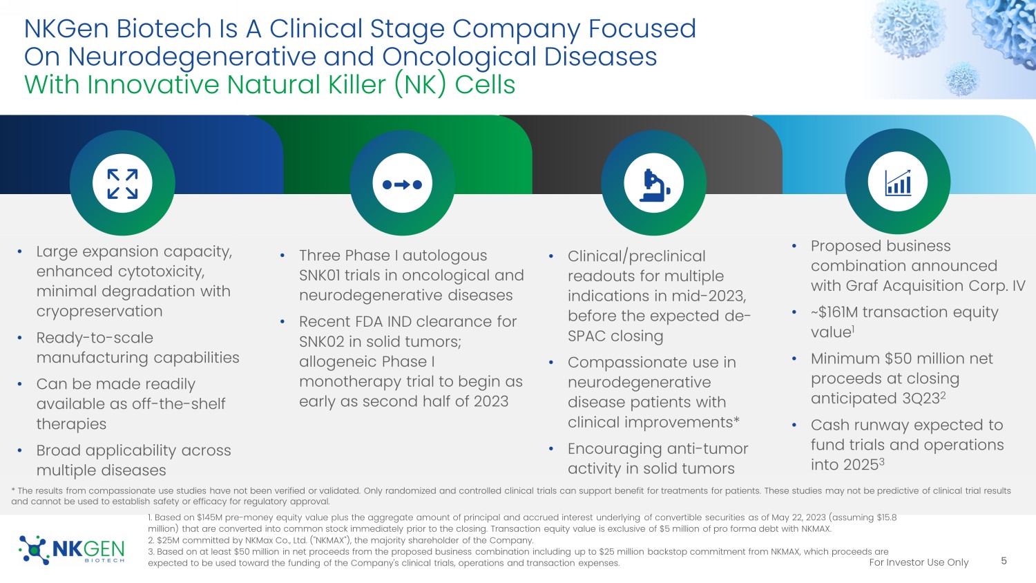For Investor Use Only Disclaimer Forward - Looking Statements This Presentation includes forward - looking statements regarding, among other things, the plans, strategies and prospects, both business and financial, of Graf and the Company . These statements are based on the beliefs and assumptions of the management of Graf and the Company . Although Graf and the Company believe that their respective plans, intentions and expectations reflected in or suggested by these forward - looking statements are reasonable, neither Graf nor the Company can assure you that either will achieve or realize these plans, intentions or expectations . Forward - looking statements are inherently subject to risks, uncertainties and assumptions . Generally, statements that are not historical facts, including statements concerning possible or assumed future actions, business strategies, events or results of operations, are forward - looking statements . These statements may be preceded by, followed by or include the words “believes,” “estimates,” “anticipates,” “expects,” “projects,” “forecasts,” “outlook,” “future,” “may,” “will,” “should,” “seeks,” “seems,” “targets,” “plans,” “scheduled,” “anticipates,” “intends” or similar expressions . The forward - looking statements are based on projections prepared by, and are the responsibility of, Graf’s or the Company’s management . These forward - looking statements are not guarantees of future performance, conditions or results, and involve a number of known and unknown risks, uncertainties, assumptions and other important factors, including changes in domestic and foreign business, market, financial, political and legal conditions, many of which are outside the control of the parties, that could cause actual results or outcomes to differ materially from those discussed in the forward - looking statements . Important factors that may affect actual results or outcomes include, among others, the inability of the parties to successfully or timely consummate the proposed Business Combination ; the failure to obtain stockholder approval of the extension of time Graf has to consummate the proposed Business Combination at any future meeting of Graf stockholders at which such proposal is presented ; the failure to satisfy the conditions to the consummation of the proposed Business Combination, including the approval of the Merger Agreement by Graf’s stockholders, the satisfaction of the minimum cash condition and the receipt of certain governmental and regulatory approvals ; the inability to obtain any PIPE investments ; the effect of the announcement or pendency of the proposed Business Combination on the Company’s business relationships, operating results, and business generally ; the risk that the proposed Business Combination disrupts the current plans and operations of the Company ; the risk that regulatory approvals for the Company’s product development are not obtained, are delayed or are subject to unanticipated conditions that could adversely affect the post - Business Combination entity (“New NKGen”) or the expected benefits of the proposed Business Combination ; the Company’s ability to manage future growth ; the Company’s ability to manage clinical trials or studies, including any compassionate use programs and product pipeline ; the risk associated with the use and reliance on the initial or preliminary results and data from the compassionate use programs and the ongoing Phase I clinical trial ; the dependence on the success of the Company’s SNK natural killer cell technology platform ; New NKGen’s ability to meet the listing standards of the New York Stock Exchange, NYSE American or Nasdaq Stock Market ; the amount of redemption requests made by Graf’s public stockholders ; the complexity of numerous regulatory and legal requirements that the Company needs to comply with to operate its business ; the failure to obtain, adequately protect, maintain or enforce the Company’s intellectual property rights ; the ability of Graf or New NKGen to issue equity or equity - linked securities in connection with the proposed Business Combination or in the future ; the concentrated ownership of New NKGen common stock among the Company’s existing executive officers, directors and principal stockholders ; and those factors discussed under the heading “Risk Factors” in the Registration Statement and other documents of Graf filed, or to be filed, with the SEC . New risk factors emerge from time to time and it is not possible to predict all such risk factors, nor can Graf or the Company assess the impact of all such risk factors on the businesses of Graf and the Company prior to the proposed Business Combination, and the combined company following the proposed Business Combination, or the extent to which any factor or combination of factors may cause actual results to differ materially from those contained in any forward - looking statements . Forward - looking statements are not guarantees of performance . You should not put undue reliance on these statements, which speak only as of the date hereof . All forward - looking statements attributable to Graf or the Company or persons acting on their behalf are expressly qualified in their entirety by the foregoing cautionary statements . Graf and the Company prior to the proposed Business Combination, and the combined company following the proposed Business Combination, undertake no obligations to update or revise publicly any forward - looking statements, whether as a result of new information, future events or otherwise, except as required by law . 4