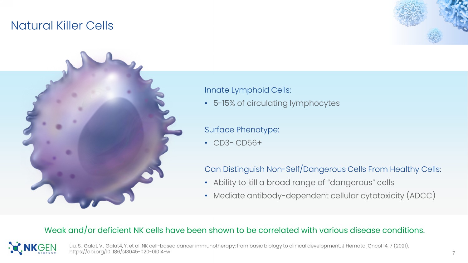 For Investor Use Only Natural Killer Cells Innate Lymphoid Cells: • 5 - 15% of circulating lymphocytes Surface Phenotype: • CD3 - CD56+ Can Distinguish Non - Self/Dangerous Cells From Healthy Cells: • Ability to kill a broad range of “dangerous” cells • Mediate antibody - dependent cellular cytotoxicity (ADCC) 7 Weak and/or deficient NK cells have been shown to be correlated with various disease conditions. Liu, S., Galat , V., Galat4, Y. et al. NK cell - based cancer immunotherapy: from basic biology to clinical development. J Hematol Oncol 14, 7 (2021). https://doi.org/10.1186/s13045 - 020 - 01014 - w