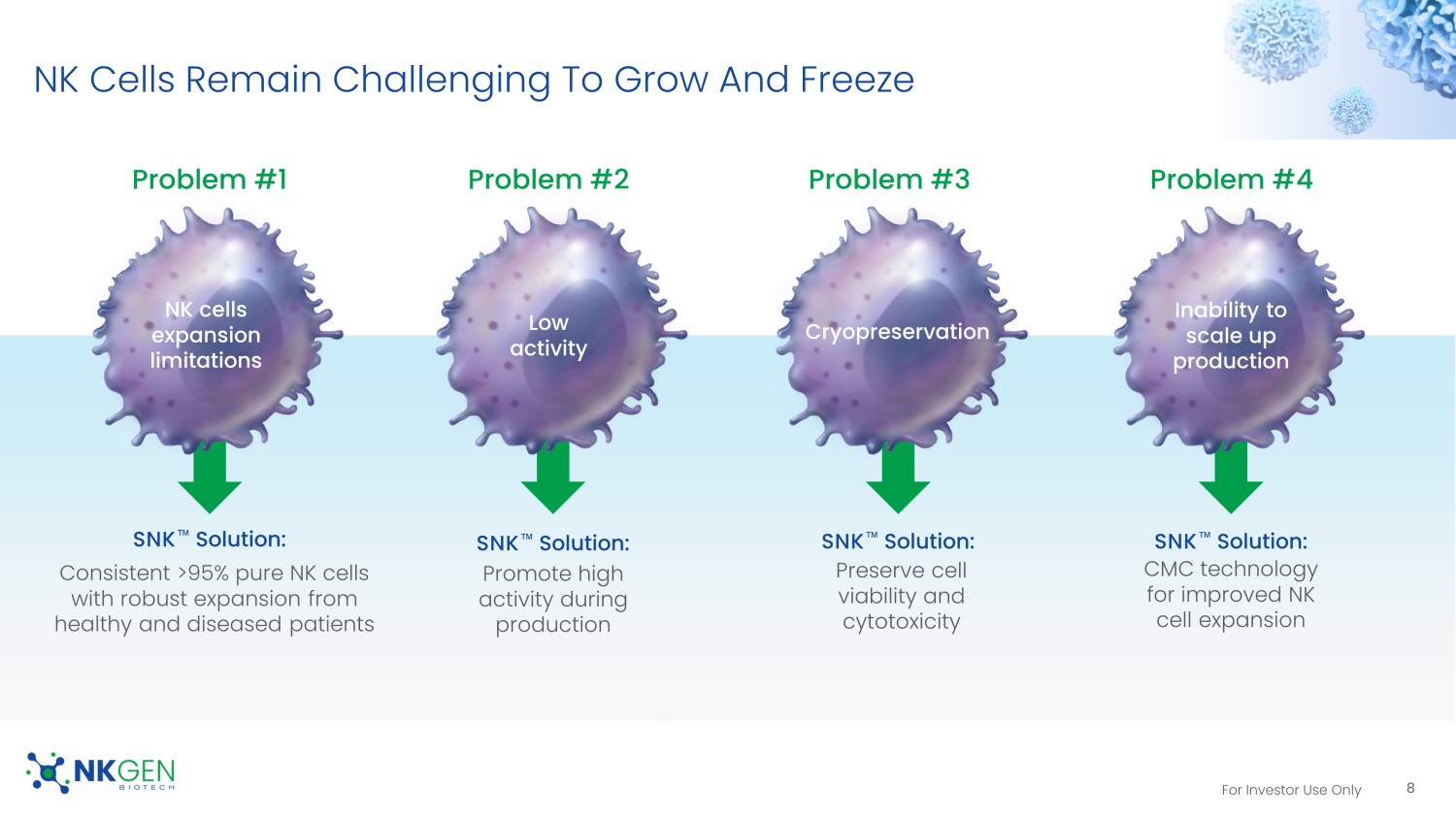 For Investor Use Only NK Cells Remain Challenging To Grow And Freeze NK cells expansion limitations Low activity Inability to scale up production Problem #2 Problem #4 SNK Œ Solution: Consistent >95% pure NK cells with robust expansion from healthy and diseased patients Promote high activity during production CMC technology for improved NK cell expansion Problem #1 Cryopreservation Preserve cell viability and cytotoxicity Problem #3 SNK Œ Solution: SNK Œ Solution: SNK Œ Solution: 8