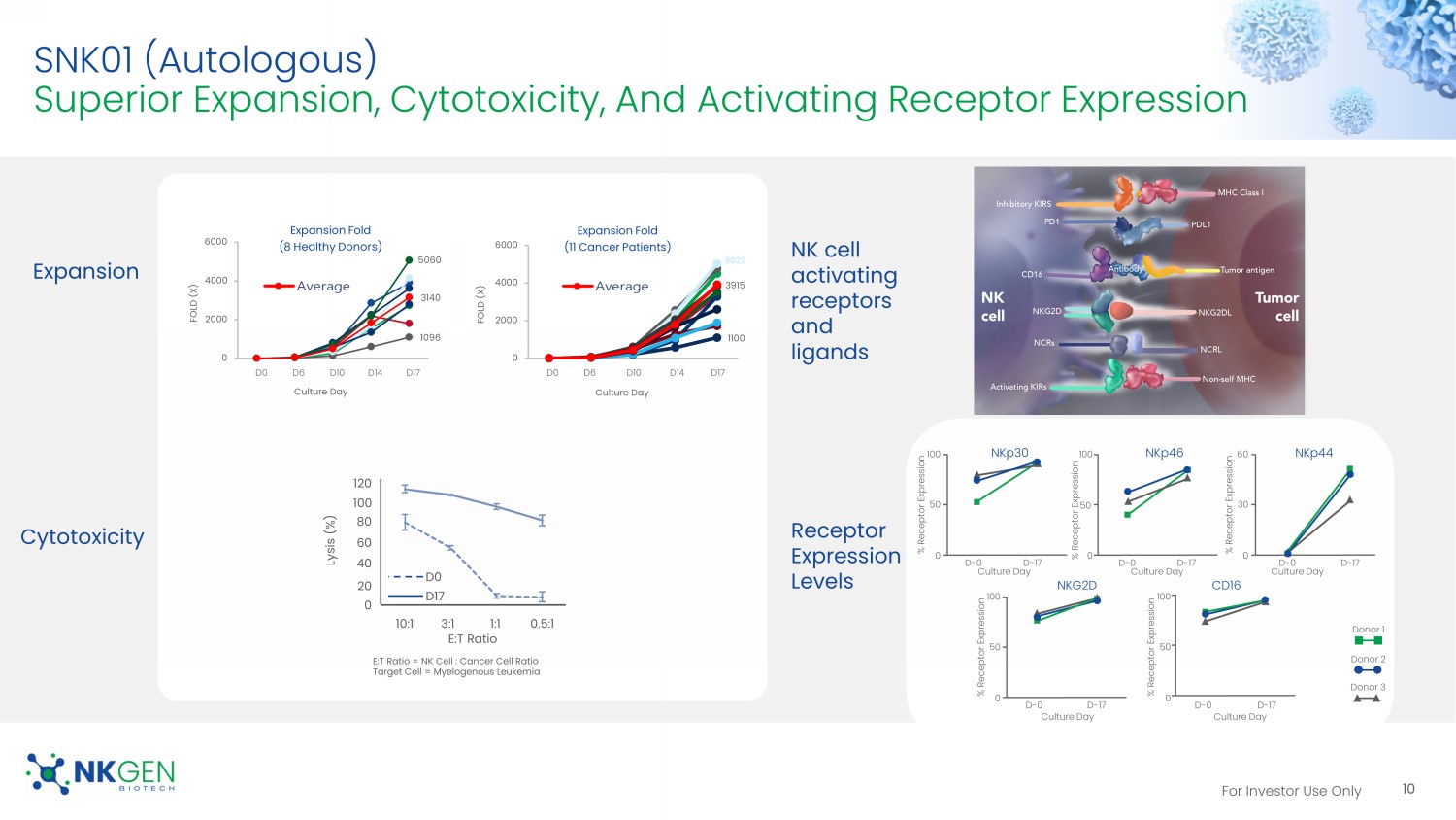 For Investor Use Only SNK01 (Autologous) Superior Expansion, Cytotoxicity, And Activating Receptor Expression Cytotoxicity Expansion NK cell activating receptors and ligands Receptor Expression Levels 10 1100 3915 0 2000 4000 6000 FOLD (X) Culture Day Expansion Fold (11 Cancer Patients) 5022 D0 D6 D10 D14 D17 D0 D6 D10 D14 D17 E:T Ratio E:T Ratio = NK Cell : Cancer Cell Ratio Target Cell = Myelogenous Leukemia 10:1 3:1 1:1 0.5:1 Lysis (%) 120 100 80 60 40 20 0 D0 D17 50 % Receptor Expression NKp30 Culture Day % Receptor Expression NKp46 NKp44 NKG2D CD16 Culture Day 100 50 0 Culture Day Culture Day Culture Day 100 0 60 30 0 % Receptor Expression % Receptor Expression 100 50 0 % Receptor Expression 100 50 0 D - 0 D - 17 D - 0 D - 17 D - 0 D - 17 D - 0 D - 17 D - 0 D - 17 Donor 1 Donor 2 Donor 3 1096 5060 3140 0 2000 4000 6000 FOLD (X) Culture Day Expansion Fold (8 Healthy Donors)