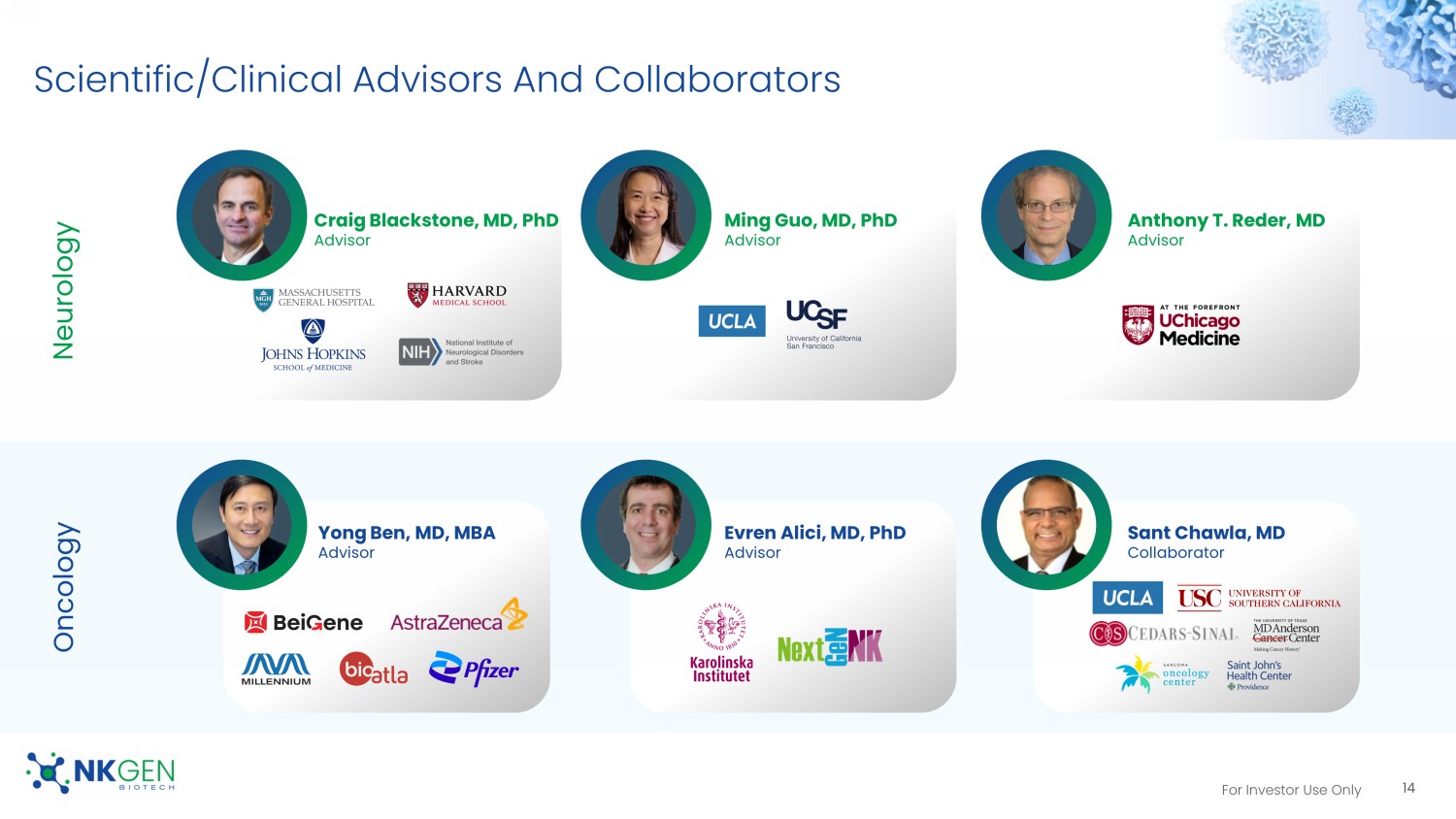 For Investor Use Only NKGen Biotech Pipeline Product IND Enabling Pre - Clinical Phase I Clinical Phase II Clinical Phase III Clinical Anticipated Milestones Autologous SNK01 Monotherapy • US IND Submission for AD – 2H2023 • US IND submission for PD – 1H2024 avelumab or pembrolizumab • Final CSR Q3 2023 Allogeneic SNK02 x IND clearance 2022 • FPI 2H2023 HER2 - CAR SNK02 • US IND submission 2025 13 Refractory PD - L1+ and PD - L1 - solid tumors Neurodegenerative Disease Oncology Targets HER2+ solid tumors