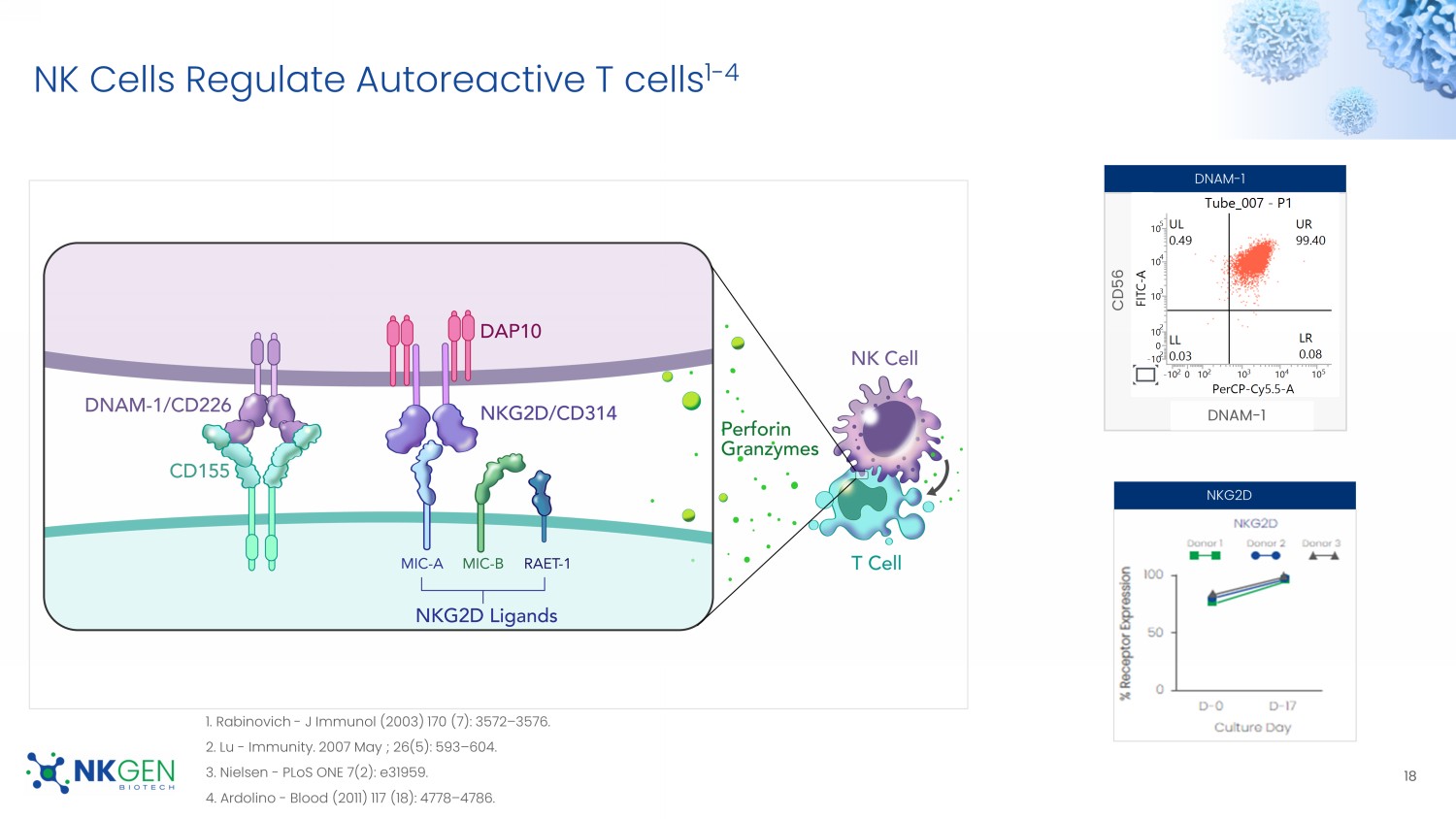 For Investor Use Only NK Cells Regulate Autoreactive T cells 1 - 4 18 1. Rabinovich - J Immunol (2003) 170 (7): 3572 – 3576. 2. Lu - Immunity. 2007 May ; 26(5): 593 – 604. 3. Nielsen - PLoS ONE 7(2): e31959. 4. Ardolino - Blood (2011) 117 (18): 4778 – 4786. DNAM - 1 NKG2D CD56 DNAM - 1