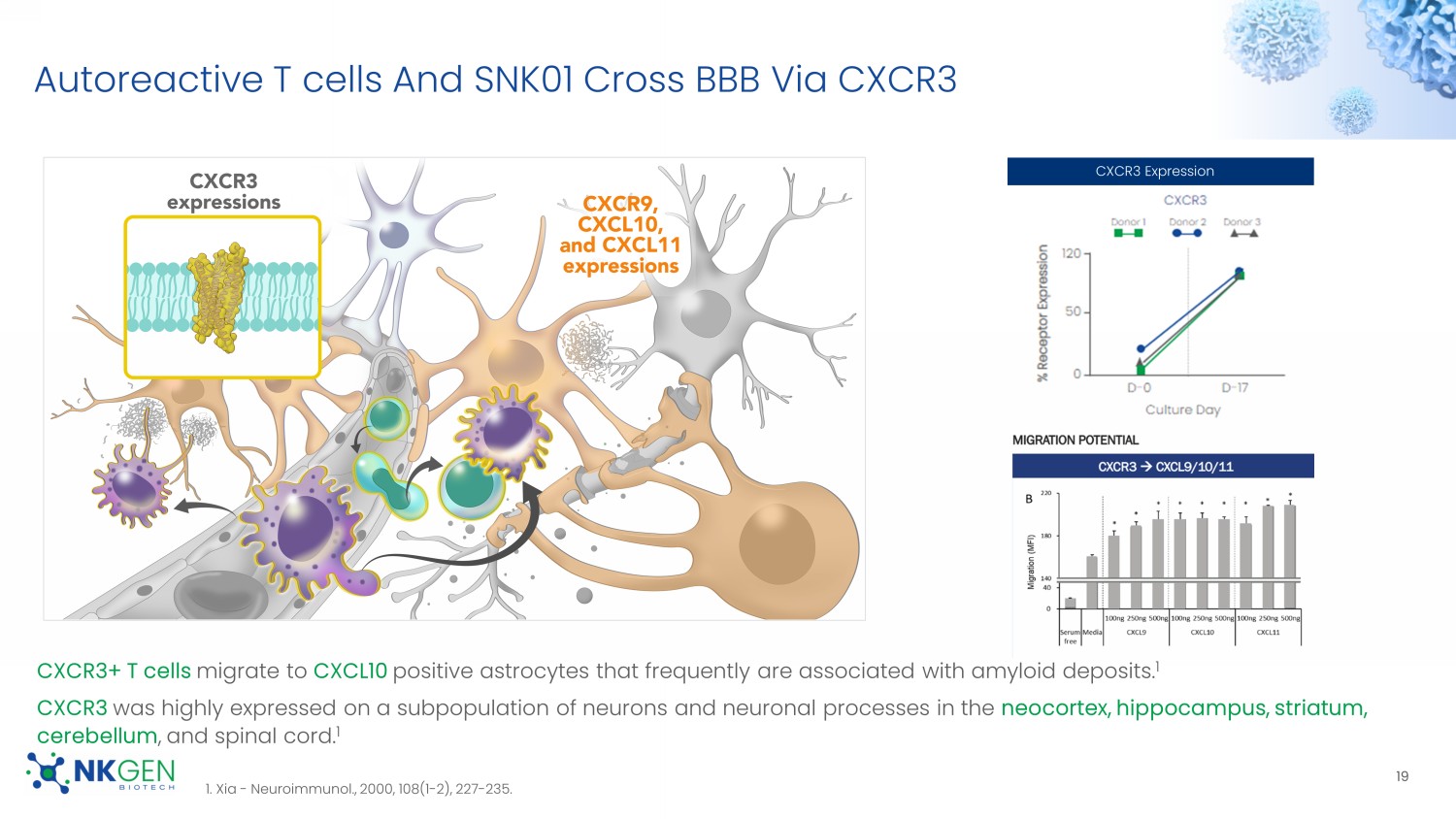 For Investor Use Only Autoreactive T cells And SNK01 Cross BBB Via CXCR3 CXCR3+ T cells migrate to CXCL10 positive astrocytes that frequently are associated with amyloid deposits. 1 CXCR3 was highly expressed on a subpopulation of neurons and neuronal processes in the neocortex, hippocampus, striatum, cerebellum , and spinal cord. 1 1. Xia - Neuroimmunol ., 2000, 108(1 - 2), 227 - 235. 19 CXCR3 Expression