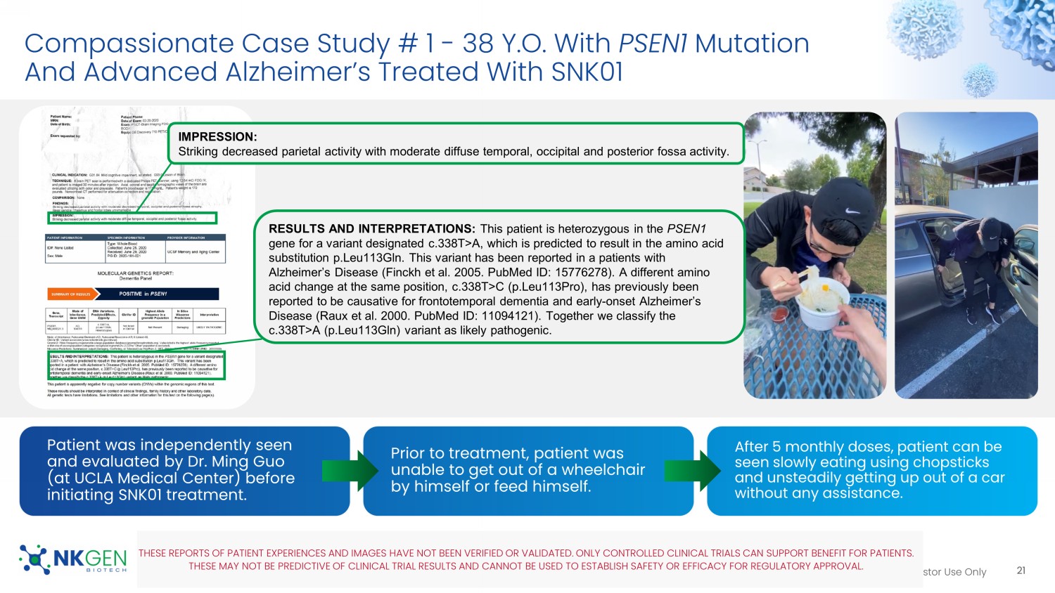 For Investor Use Only Compassionate Case Study # 1 - 38 Y.O. With PSEN1 Mutation And Advanced Alzheimer’s Treated With SNK01 THESE REPORTS OF PATIENT EXPERIENCES AND IMAGES HAVE NOT BEEN VERIFIED OR VALIDATED. ONLY CONTROLLED CLINICAL TRIALS CAN SUPP ORT BENEFIT FOR PATIENTS. THESE MAY NOT BE PREDICTIVE OF CLINICAL TRIAL RESULTS AND CANNOT BE USED TO ESTABLISH SAFETY OR EFFICACY FOR REGULATORY APPRO VAL . 21 Patient was independently seen and evaluated by Dr. Ming Guo (at UCLA Medical Center) before initiating SNK01 treatment. Prior to treatment, patient was unable to get out of a wheelchair by himself or feed himself. After 5 monthly doses, patient can be seen slowly eating using chopsticks and unsteadily getting up out of a car without any assistance. IMPRESSION: Striking decreased parietal activity with moderate diffuse temporal, occipital and posterior fossa activity. RESULTS AND INTERPRETATIONS: This patient is heterozygous in the PSEN1 gene for a variant designated c.338T>A, which is predicted to result in the amino acid substitution p.Leu113Gln. This variant has been reported in a patients with Alzheimer’s Disease ( Finckh et al. 2005. PubMed ID: 15776278). A different amino acid change at the same position, c.338T>C (p.Leu113Pro), has previously been reported to be causative for frontotemporal dementia and early - onset Alzheimer’s Disease ( Raux et al. 2000. PubMed ID: 11094121). Together we classify the c.338T>A (p.Leu113Gln) variant as likely pathogenic.