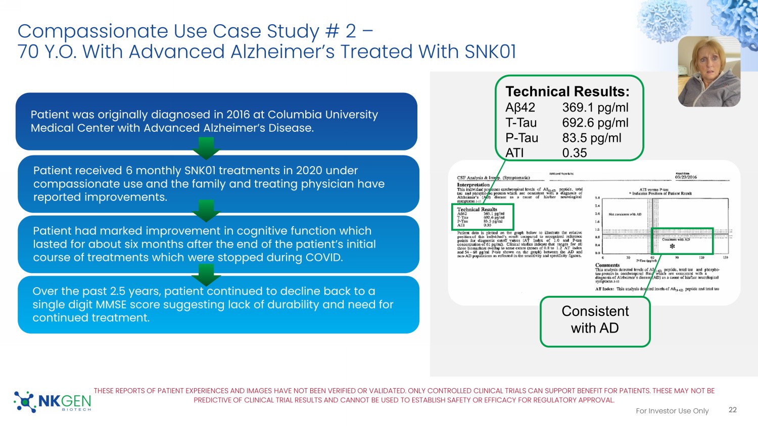 For Investor Use Only Compassionate Use Case Study # 2 – 70 Y.O. With Advanced Alzheimer’s Treated With SNK01 22 Patient was originally diagnosed in 2016 at Columbia University Medical Center with Advanced Alzheimer’s Disease. Patient received 6 monthly SNK01 treatments in 2020 under compassionate use and the family and treating physician have reported improvements. Patient had marked improvement in cognitive function which lasted for about six months after the end of the patient’s initial course of treatments which were stopped during COVID. Over the past 2.5 years, patient continued to decline back to a single digit MMSE score suggesting lack of durability and need for continued treatment. THESE REPORTS OF PATIENT EXPERIENCES AND IMAGES HAVE NOT BEEN VERIFIED OR VALIDATED. ONLY CONTROLLED CLINICAL TRIALS CAN SUPP ORT BENEFIT FOR PATIENTS. THESE MAY NOT BE PREDICTIVE OF CLINICAL TRIAL RESULTS AND CANNOT BE USED TO ESTABLISH SAFETY OR EFFICACY FOR REGULATORY APPROVAL. Technical Results: A β 42 369.1 pg /ml T - Tau 692.6 pg /ml P - Tau 83.5 pg /ml ATI 0.35 Consistent with AD