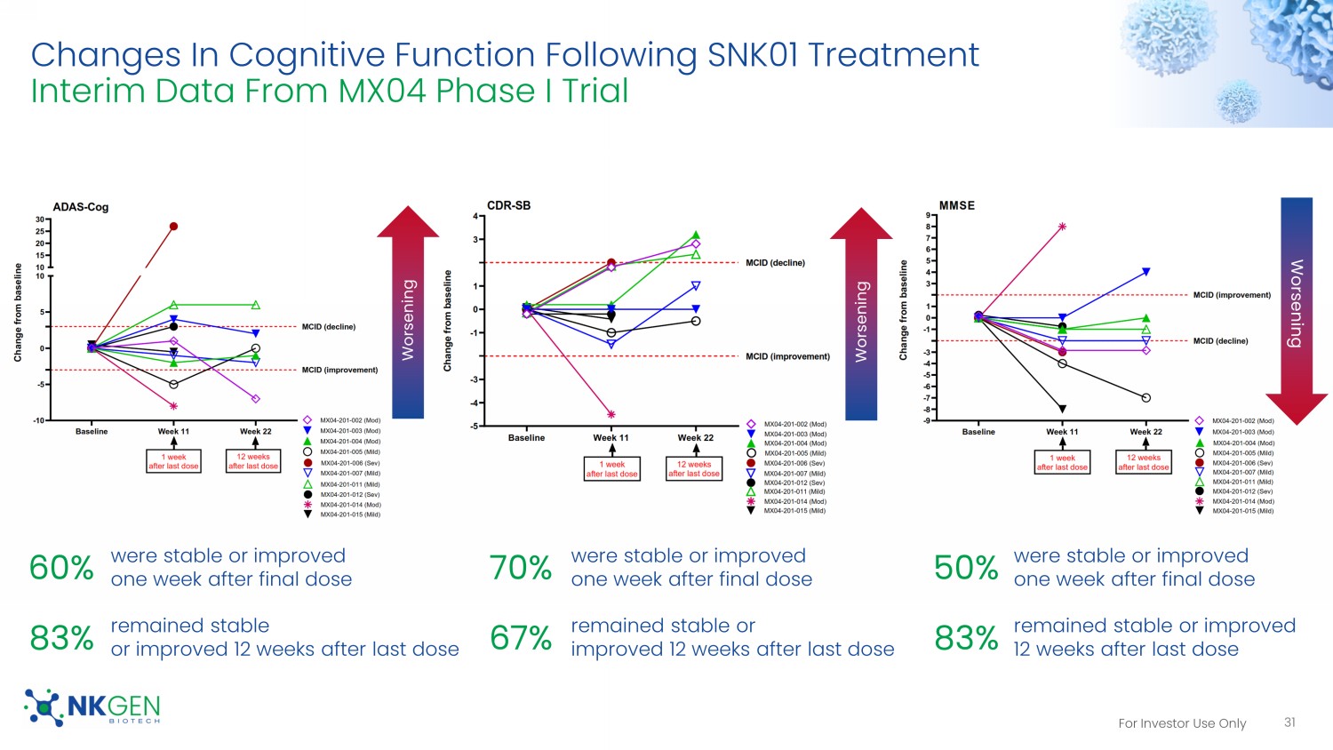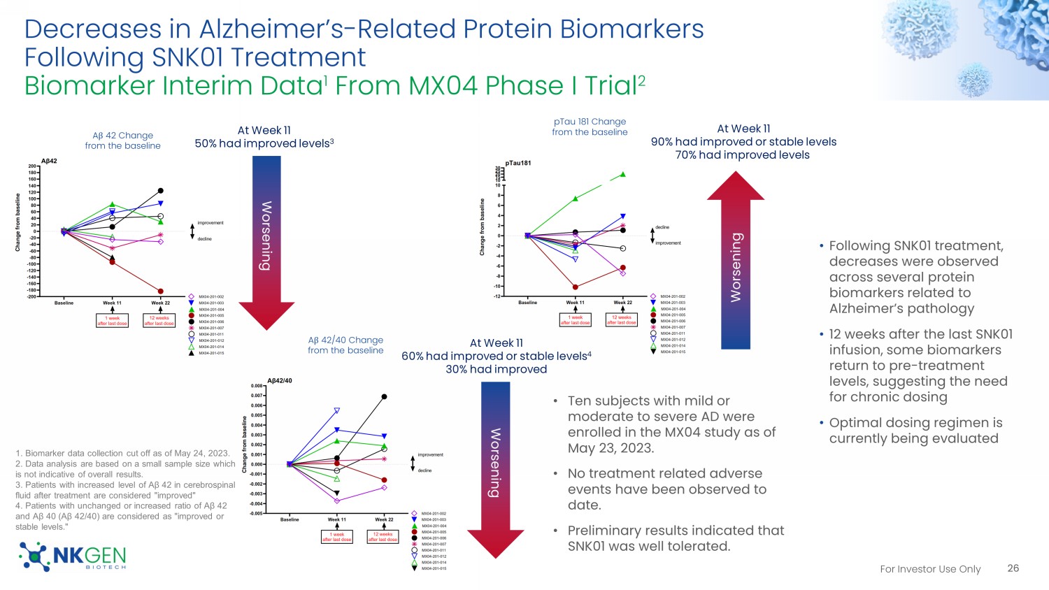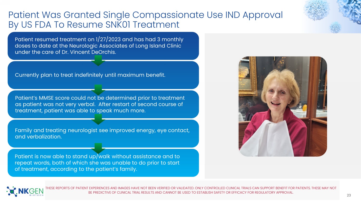For Investor Use Only Patient Was Granted Single Compassionate Use IND Approval By US FDA To Resume SNK01 Treatment 23 THESE REPORTS OF PATIENT EXPERIENCES AND IMAGES HAVE NOT BEEN VERIFIED OR VALIDATED. ONLY CONTROLLED CLINICAL TRIALS CAN SUPP ORT BENEFIT FOR PATIENTS. THESE MAY NOT BE PREDICTIVE OF CLINICAL TRIAL RESULTS AND CANNOT BE USED TO ESTABLISH SAFETY OR EFFICACY FOR REGULATORY APPROVAL. Patient resumed treatment on 1/27/2023 and has had 3 monthly doses to date at the Neurologic Associates of Long Island Clinic under the care of Dr. Vincent DeOrchis . Currently plan to treat indefinitely until maximum benefit. Patient’s MMSE score could not be determined prior to treatment as patient was not very verbal. After restart of second course of treatment, patient was able to speak much more. Family and treating neurologist see improved energy, eye contact, and verbalization. Patient is now able to stand up/walk without assistance and to repeat words, both of which she was unable to do prior to start of treatment, according to the patient’s family.