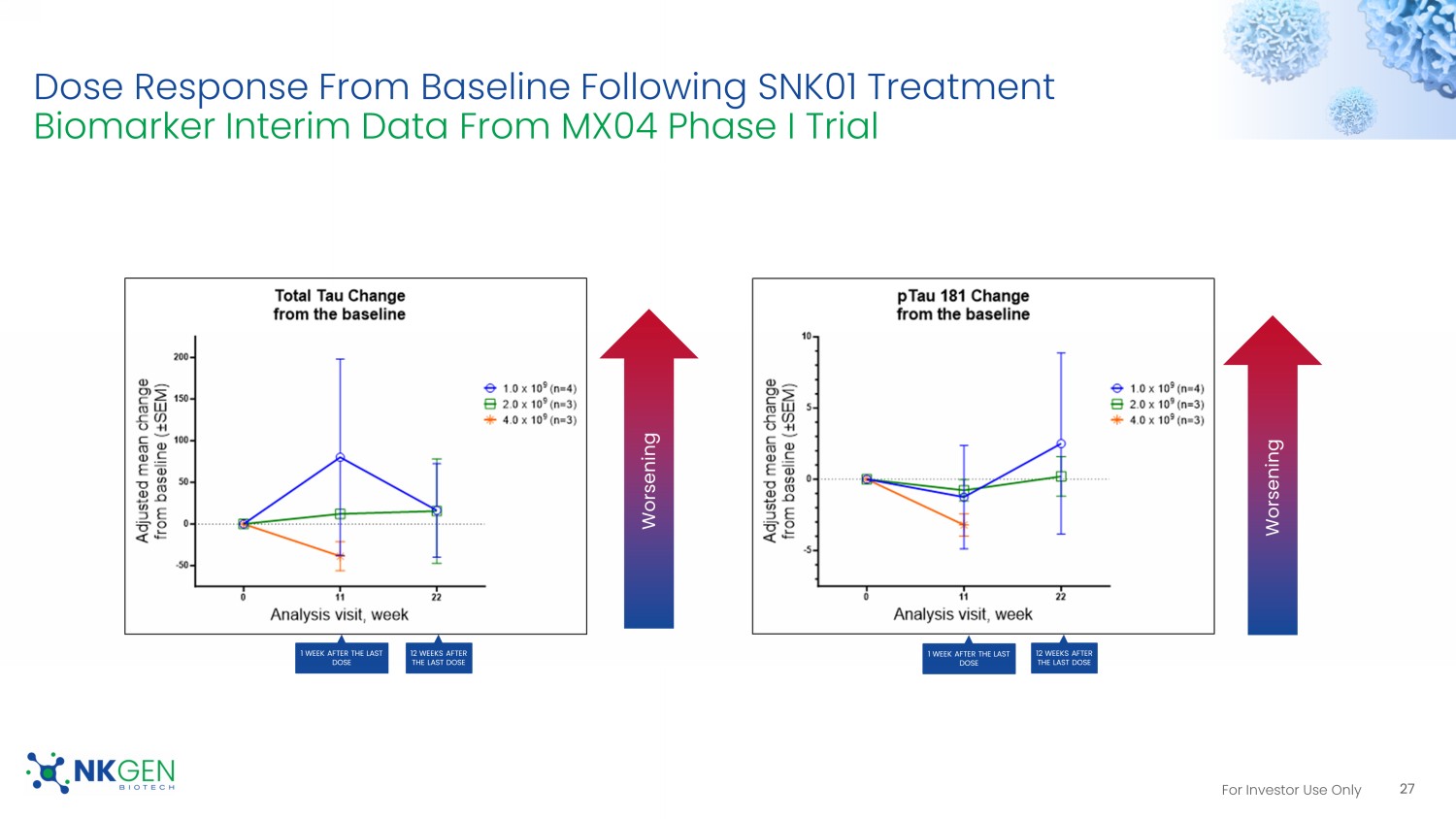 For Investor Use Only Decreases in Alzheimer’s - Related Protein Biomarkers Following SNK01 Treatment Biomarker Interim Data 1 From MX04 Phase I Trial 2 26 • Following SNK01 treatment, decreases were observed across several protein biomarkers related to Alzheimer’s pathology • 12 weeks after the last SNK01 infusion, some biomarkers return to pre - treatment levels, suggesting the need for chronic dosing • Optimal dosing regimen is currently being evaluated Worsening A β 42 Change from the baseline A β 42/40 Change from the baseline Worsening pTau 181 Change from the baseline Worsening At Week 11 50% had improved levels 3 At Week 11 90% had improved or stable levels 70% had improved levels At Week 11 60% had improved or stable levels 4 30% had improved 1. Biomarker data collection cut off as of May 24, 2023.​ 2. Data analysis are based on a small sample size which is not indicative of overall results​. 3. Patients with increased level of Aβ 42 in cerebrospinal fluid after treatment are considered "improved"​ 4. Patients with unchanged or increased ratio of Aβ 42 and Aβ 40 (Aβ 42/40) are considered as "improved or stable levels." • Ten subjects with mild or moderate to severe AD were enrolled in the MX04 study as of May 23, 2023. • No treatment related adverse events have been observed to date. • Preliminary results indicated that SNK01 was well tolerated.