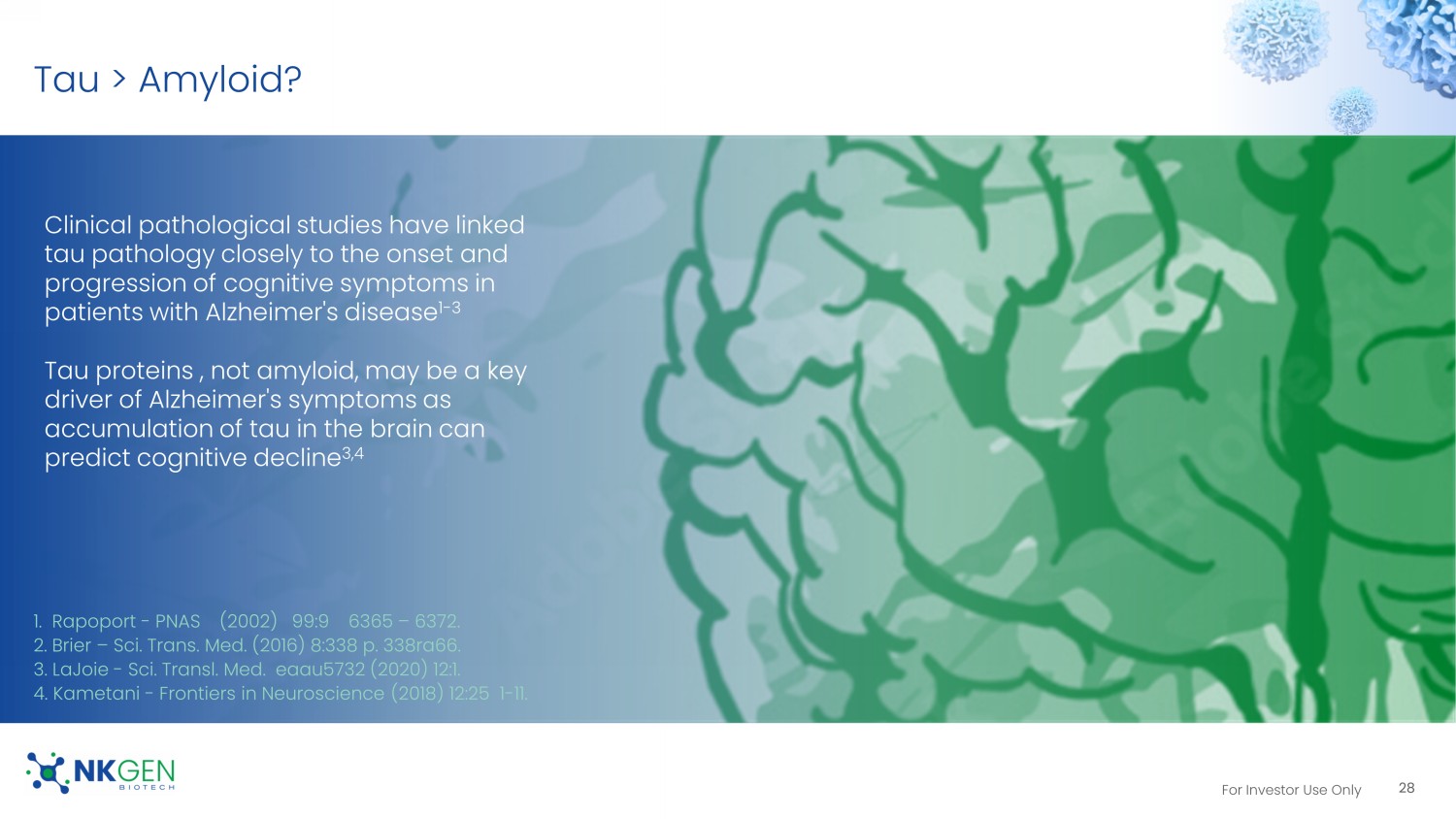 For Investor Use Only Tau > Amyloid? 1. Rapoport - PNAS   (2002)   99:9   6365 – 6372. 2. Brier – Sci. Trans. Med. (2016) 8:338 p. 338ra66. 3. LaJoie - Sci. Transl. Med. eaau5732 (2020) 12:1. 4. Kametani - Frontiers in Neuroscience (2018) 12:25 1 - 11. 28 Clinical pathological studies have linked tau pathology closely to the onset and progression of cognitive symptoms in patients with Alzheimer's disease 1 - 3 Tau proteins , not amyloid, may be a key driver of Alzheimer's symptoms as accumulation of tau in the brain can predict cognitive decline 3,4