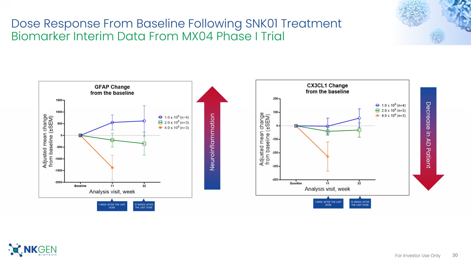 For Investor Use Only Decreases In Alzheimer’s - Related Inflammatory Markers Following SNK01 Treatment Biomarker Interim Data From MX04 Phase I Trial 29 • Following SNK01 treatment, reductions were observed across several neuroinflammatory markers related to Alzheimer’s pathology • 12 weeks after the last SNK01 infusion, some neuroinflammation markers return to pre - treatment levels, suggesting the need for chronic dosing • NF - L marker also indicates a decrease in damaged neurons Neuroinflammation GFAP Change from the baseline NF - L Change from the baseline YKL - 40 Change from the baseline Neuroinflammation Worsening At Week 11 60% had improved levels At Week 11 50% had improved or stable levels 30% had improved At Week 11 60% had improved or stable levels 50% improved