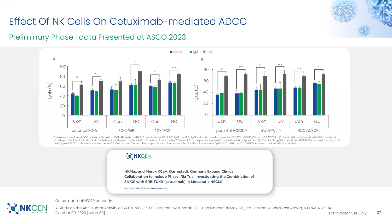 For Investor Use Only Effect Of NK Cells On Cetuximab - mediated ADCC Preliminary Phase I data Presented at ASCO 2023 Cetuximab: anti - EGFR antibody. A Study on the Anti - Tumor Activity of SNK01 in EGFR - TKI - Resistant Non - small Cell Lung Cancer, NKMax Co., Ltd., Internal In Vitro Test Report , NKMAX - R20 - 04 , October 30, 2020 [page 30]. 37 IgG Media EGFR Lysis (%) Lysis (%) parental PC - 9 PC - 9/GR PC - 9/OR parental HCC827 HCC827/GR HCC827/OR Con GC Con GC Con GC Con GC Con GC Con GC Cetuximab - mediated ADCC activity of NK cells in EGFR - TKI - resistant NSCLC cells. Parental PC - 9, PC - 9/GR, and PC - 9/OR cells (A) as well as parental HCC827, HCC827/GR and HCC827/OR NSCLC cells (B) were treated w ith (GC) or without (Con) gemcitabine plus carboplatin for 24 hours and then co - cultured with NK cells for 2 hours at the E:T ratio of 3:1 in the pr esence of media alone (Media), isotype control IgG antibody (IgG) or cetuximab (EGFR). The cytotoxic activity of NK cells against NSCLC cells was shown as mean ̃ SD. One - way ANOVA with Tukey’s post hoc analysis was applied for statistical analysis. *p<0.05, **p<0.01, and ***p<0.005, relati ve to untreated cells (Media). A B ** ** * * *** *** *** *** *** ** * 100 80 60 40 20 0 80 60 40 20 0