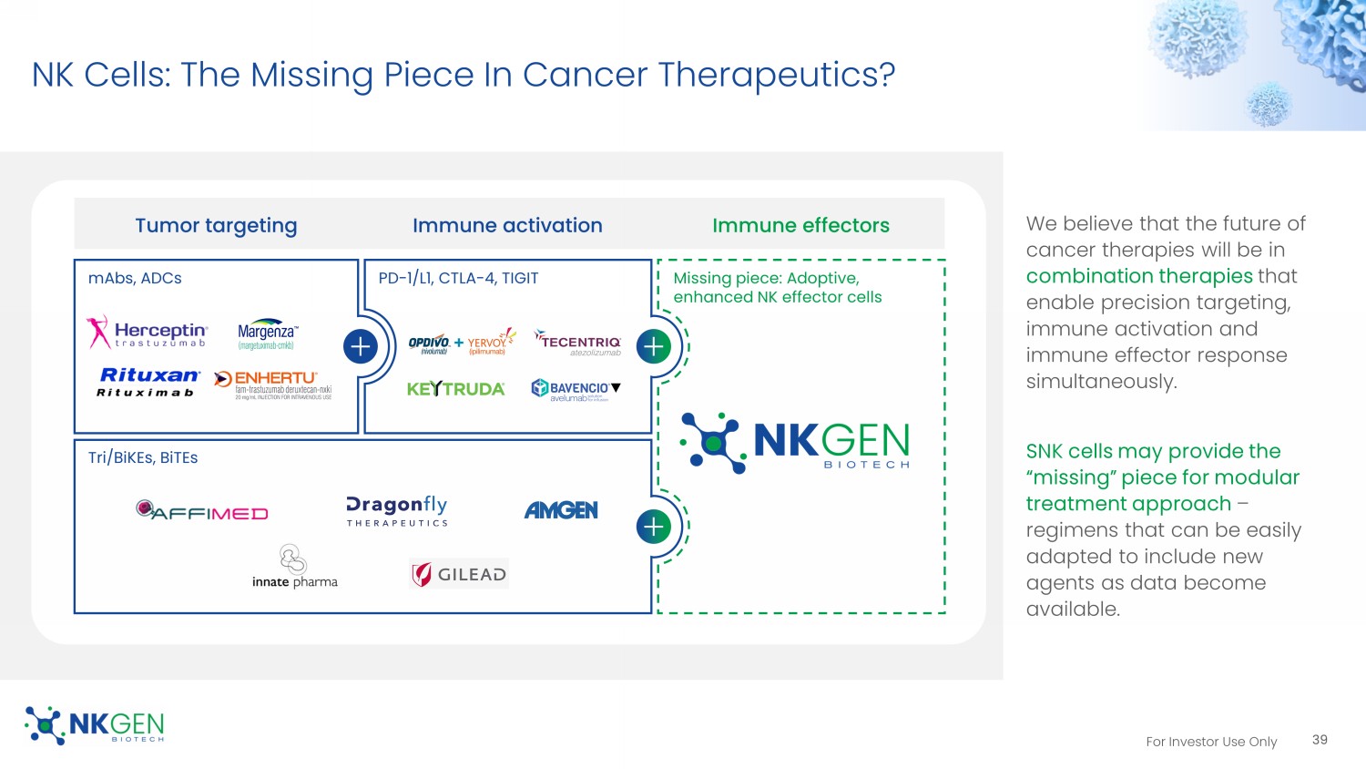 For Investor Use Only ASCO 2023 Poster Presentation SNK01 Phase I/ IIa Clinical Trial Results ClinicalTrials.gov Identifier: NCT04872634 12 patients with TKI resistant metastatic NSCLC were evaluated Dose - limiting toxicity was not observed, therefore the maximum tolerated dose of SNK01 was determined to be 6 ̩ 10 9 cells/dose No SNK01 - related adverse events of Grade 3 or higher were observed The objective response rate was 25% (3/12), disease control rate (DCR) was 100%, with 3/12 patients experiencing a partial response (25%) and 9/12 with stable disease (75%) for the total of the 12 patients Median progression free survival (PFS) was 143 days. Some patients are still being followed and an updated PFS will be provid ed at a later date 38 Choi, M.G. et al. Poster #45, ASCO 2023.