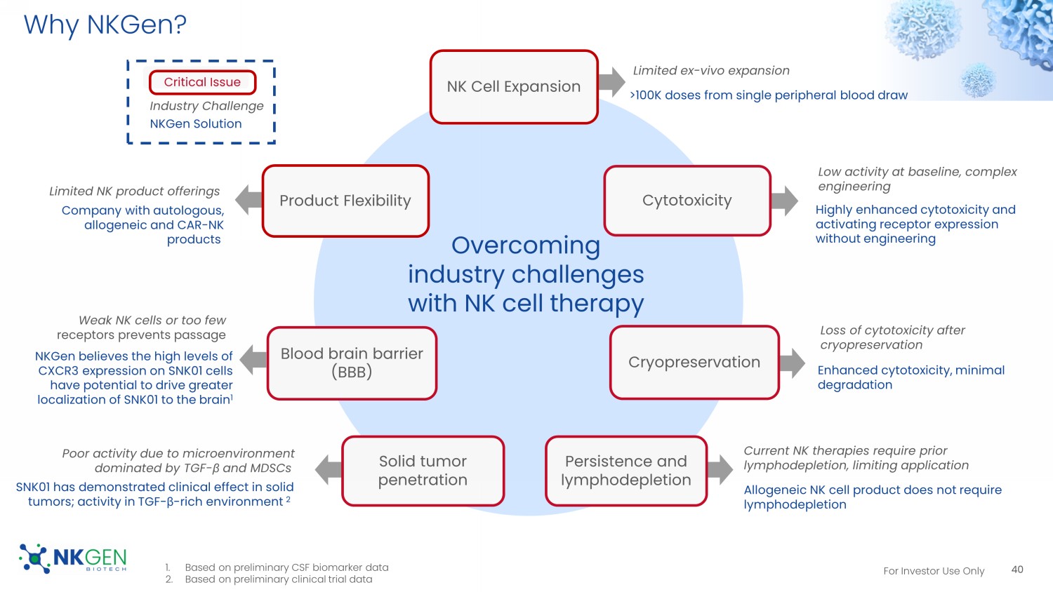 For Investor Use Only NK Cells: The Missing Piece In Cancer Therapeutics? We believe that the future of cancer therapies will be in combination therapies that enable precision targeting, immune activation and immune effector response simultaneously. SNK cells may provide the “missing” piece for modular treatment approach – regimens that can be easily adapted to include new agents as data become available. 39 Tumor targeting Immune activation Immune effectors Tri/ BiKEs , BiTEs mAbs , ADCs PD - 1/L1, CTLA - 4, TIGIT Missing piece: Adoptive, enhanced NK effector cells